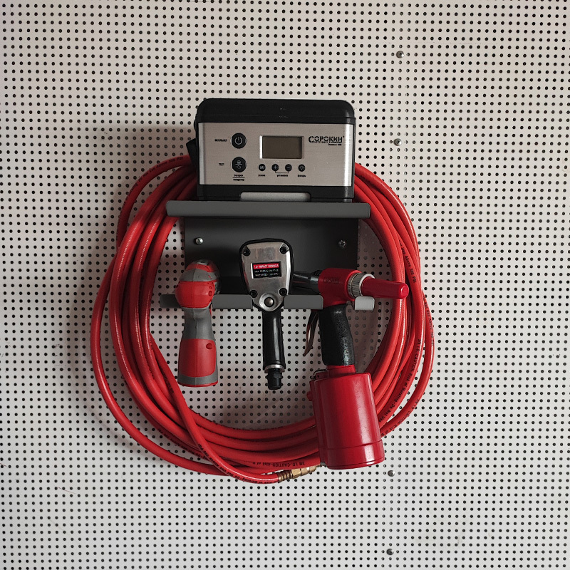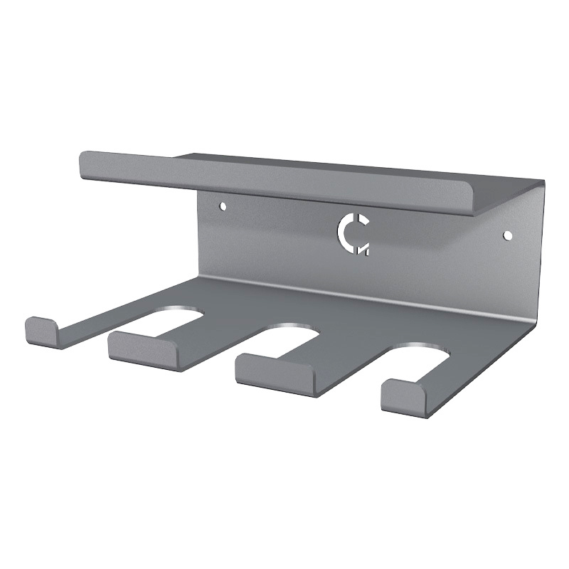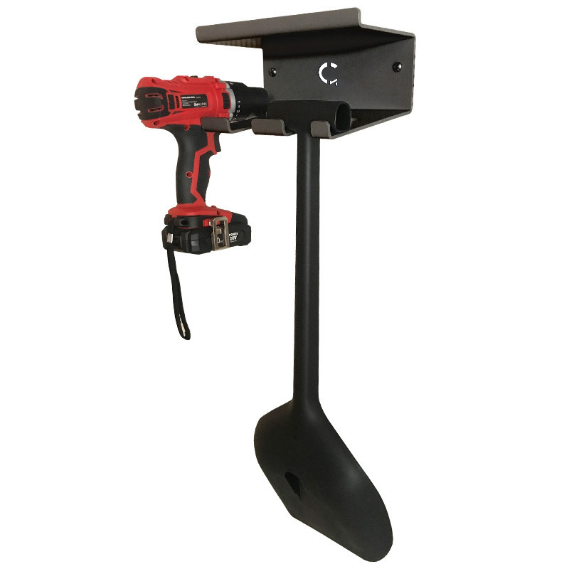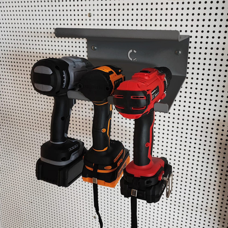 Держатель аккумуляторного инструмента предназначен для удобного хранения в одном месте сразу трёх аккумуляторных инструментов, таких как шуруповёрты, винтовёрты и гайковёрты, отвёртки и любого другого инструмента с похожими рукоятками.Держатель изготовлен из пластины толщиной 4мм и покрыт порошковой краской, предотвращающей ржавчину.На вертикальной планке кронштейна для крепления на стену предусмотрены 2 отверстия.