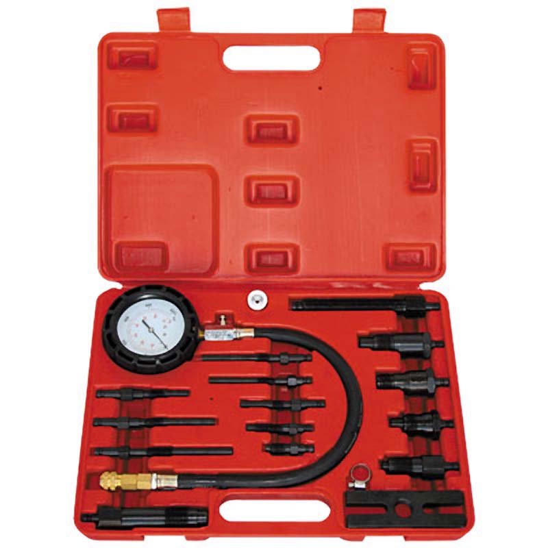 Компрессометр предназначен для измерения давления конца такта сжатия на дизельных двигателях различных автомобилей. Измерительный манометр имеет прочный гибкий шланг с быстросъёмным разъёмом, диапазон измерения 0 – 70 бар, цена деления 1 бар. В комплект входит набор наиболее распространённых резьбовых адаптеров для измерения через резьбовые отверстия форсунок.
