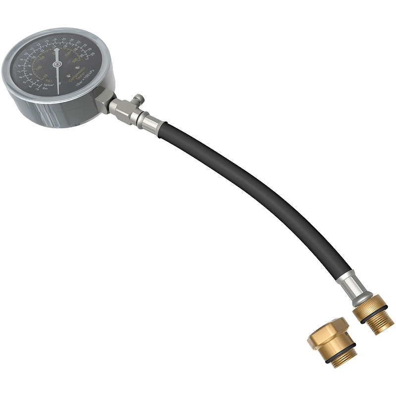 Компрессометр предназначен для измерения давления в камере сгорания бензиновых двигателей внутреннего сгорания.Прибор для измерения давления в камере сгорания состоит из манометра, гибкого шланга и резьбового штуцера с резьбой М14х1.25 на который накручивается переходник с резьбой М18х1.5. Штуцер и переходник снабжены резиновыми уплотнительными кольцами, что исключает возможность утечки газа и неточности показаний.