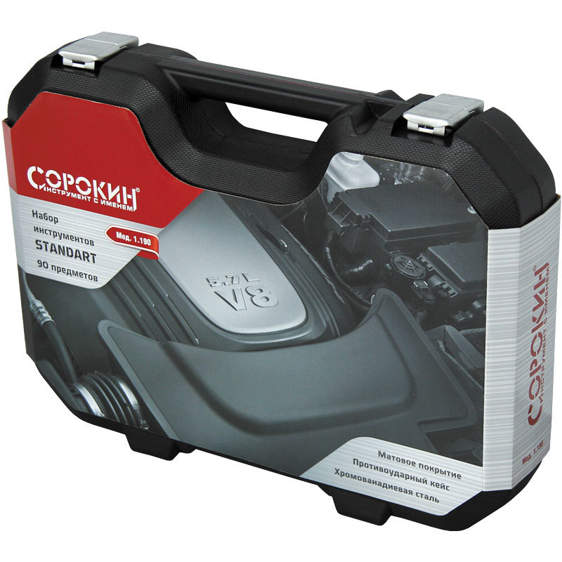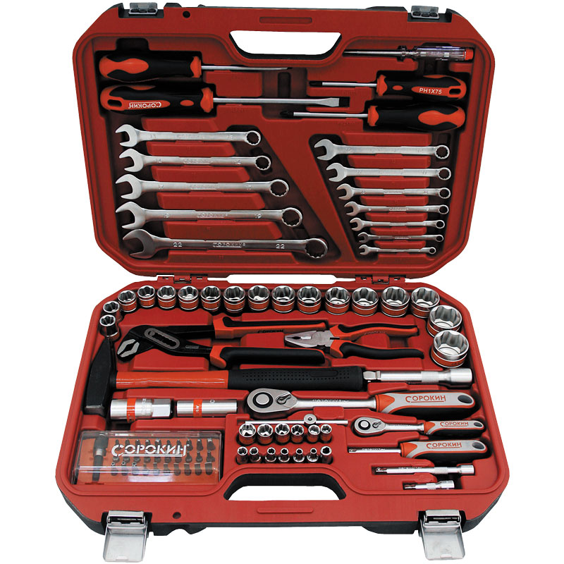 Наборы Standart - это наборы инструмента различного вида и назначения в компактном кейсе. Вы никогда не столкнетесь с проблемой поиска нужного инструмента! Каждый элемент на своем месте с обозначением вида и размера. Весь инструмент выполнен из хромованадиевой стали с матовым хромовым покрытием, что гарантирует высокую прочность, износоустойчивость и долговечность. Комплектация: 1/4" Головки SUPER LOCK 4-4.5-5-5.5-6-7-8-9-10-11-12-13 мм 12 1/4" Ключ трещоточный 72 "зубца" 1 1/4" Удлинители 50-100 мм 2 1/4" Держатель для бит 1 1/4" Вороток Т-образный 1 1/4" Адаптер 1 1/2" Головки SUPER LOCK 13-14-15-16-17-18-19-20-21-22-23-24-25-26-27-30-32 мм 17 1/2" Головки свечные SUPER LOCK 16-21 мм 2 1/2" Ключ трещоточный 72 "зубца" 1 1/2" Удлинитель 125 мм 1 Ключи комбинированные 6-7-8-9-10-11-12-13-14-17-19-22 мм 12 Пассатижи 6" 1 Клещи переставные 10" 1 Отвёртки: Шлицевые: 6.5х100, 8х150 мм 2 Крестовые: 1х75, 2х100 мм 2 Автотестер 1 Молоток слесарный 300 г 1 Набор бит 31 предмет: PH: 0-1-2-3-4 5 PZ: 0-1-2-3-4 5 TX: T10-T15-T20-T25-T27-T20 6 Шестигранные: 1.5-2-2.5-3-4-5-6 мм 7 Шлицевые: 3-4-4.5-5-5.5-6-7 мм 7 Адаптер 1