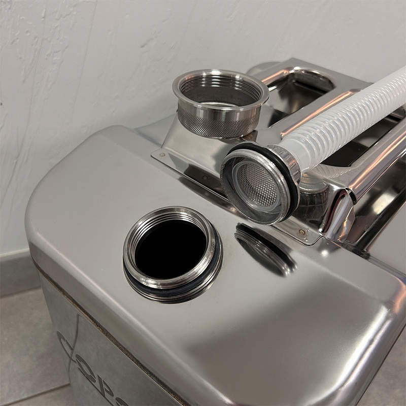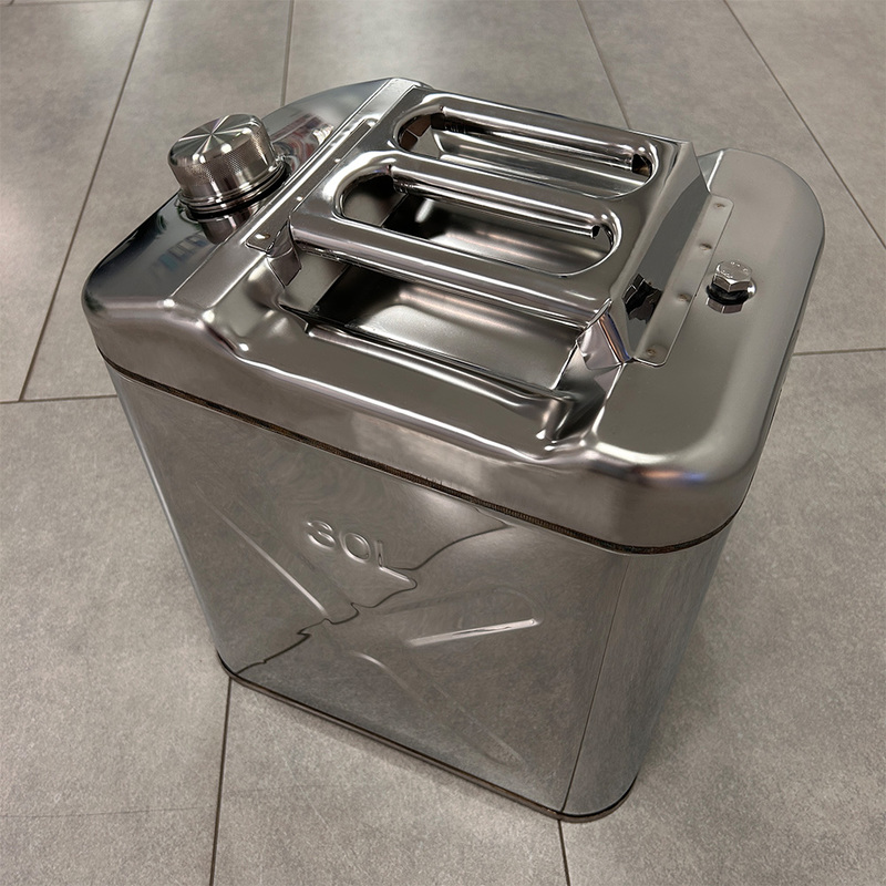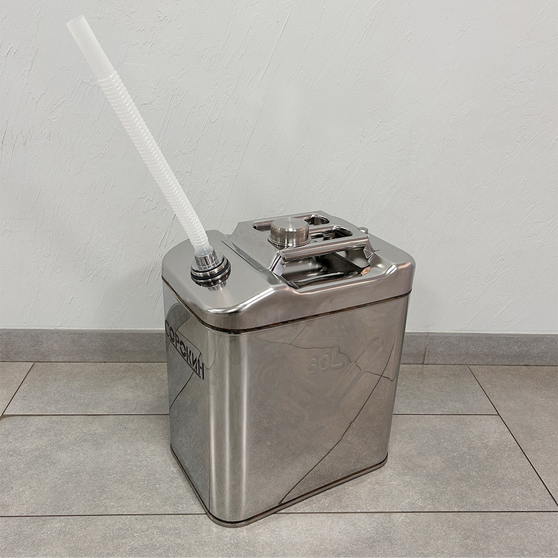 Канистра предназначена для хранения и транспортировки ГСМ, бензина и других видов топлива. В комплект входит гофрированная заливная трубка, которая убирается вовнутрь канистры и надежная резьбовая крышка, благодаря которой при хранении и транспортировке исключено протекание и испарение. Так же в конструкции предусмотрен клапан избыточного давления. Ёмкость изготовлена из листовой нержавеющей стали, что полностью исключает возможность образования коррозии.