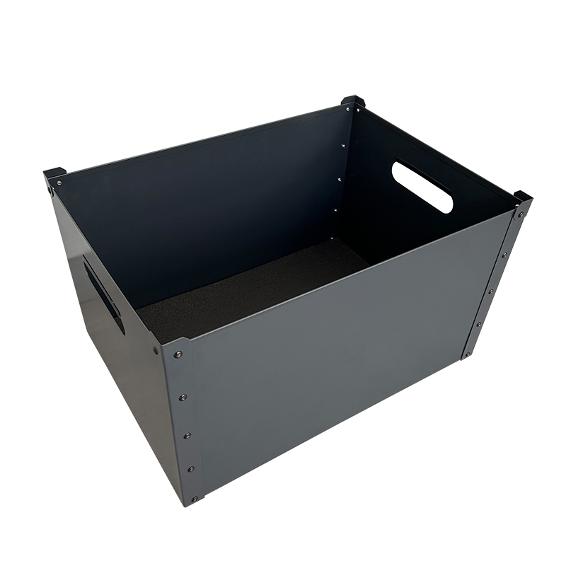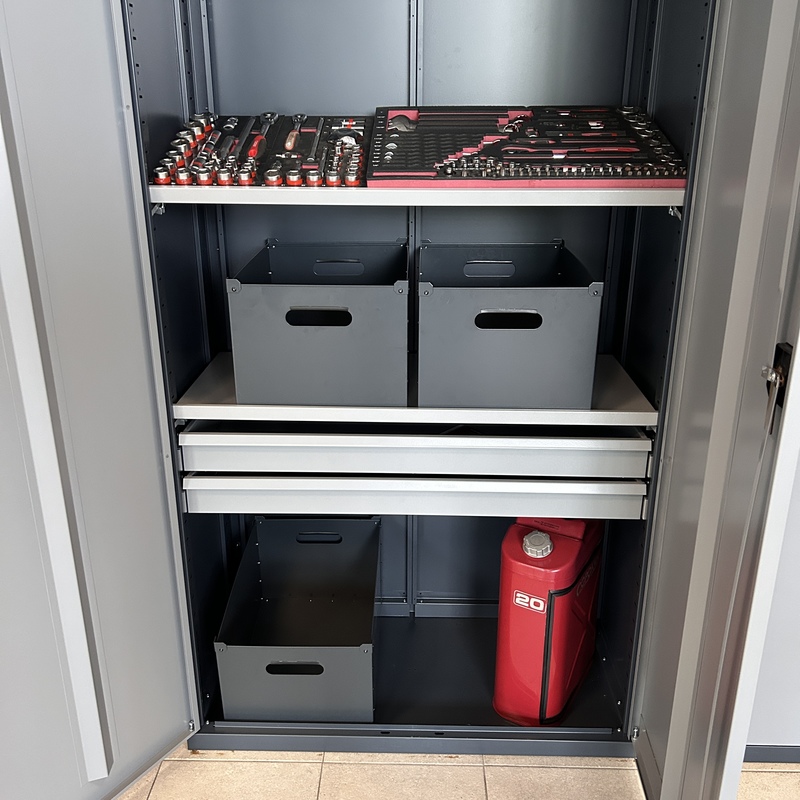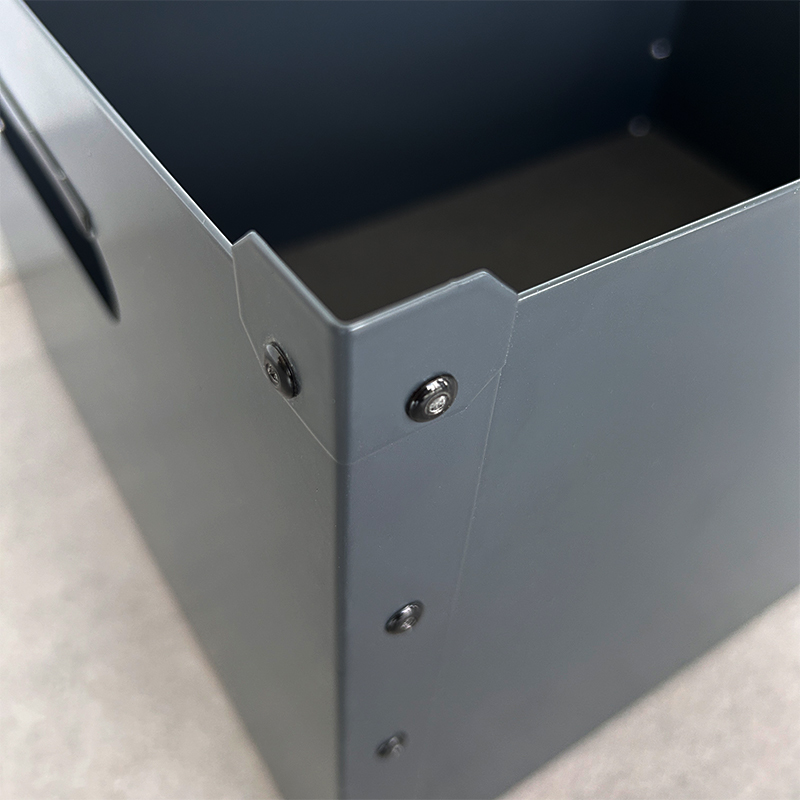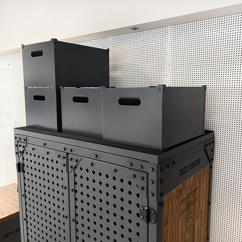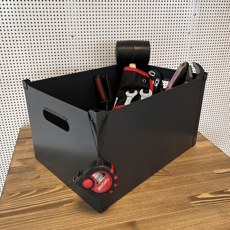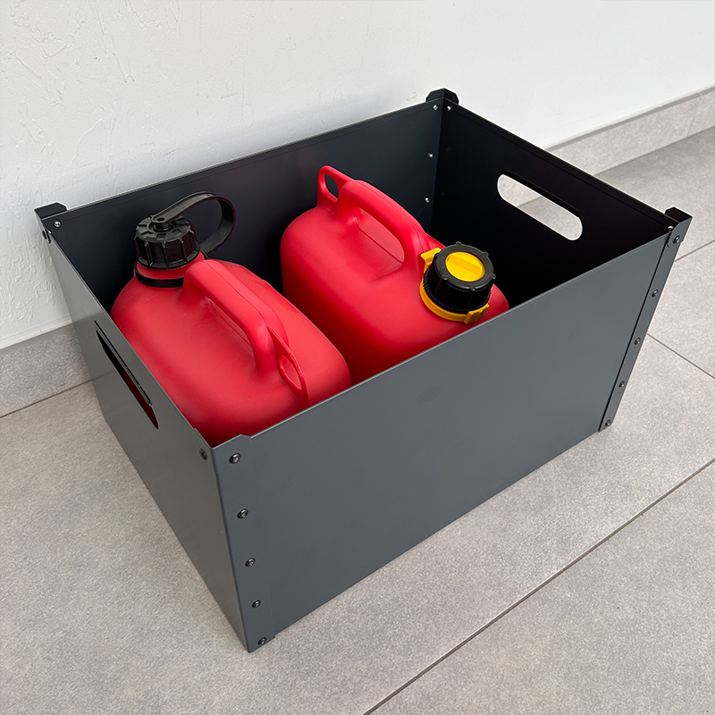 За минималистичным дизайном контейнера кроется многофункциональность и прагматичность, что делает его нужным в гараже и складском помещении.Данный контейнер, в отличии от пластиковых аналогов не просто хорошо подходит для организации пространства, он был создан , в том числе, для хранения горючих веществ, ветоши, и прочих деталей склонных к самовоспламенению или требующих повышенной безопасности. Изготовленный из листового металла толщиной 0,7мм, покрытый краской для защиты от коррозии контейнер не заржавеет, что обеспечит долгий срок службы и сохранность не только его, но и содержимого.Ящик для хранения можно смело назвать органайзером благодаря его форме: удобные, не выступающие за габариты ящика ручки, ровные прямые линии, фиксирующие уголки – все это позволяет оптимально комбинировать положения нескольких ящиков. Ящики отлично примыкают друг к другу гранями при размещении на одной плоскости, например на полках стеллажей и шкафов, где контейнеры будут актуальны для хранения особо ценных документов и прочих важных бумаг. Кроме того, конструкция ящиков позволяет составлять их в колонну до 6 штук.На дне контейнера проложен пенолоновый коврик, что оберегает хранящиеся предметы от скольжения и нежелательного повреждения. Дополнительно можно укомплектовать ящик поролоновым вкладышем необходимого размера и конфигурации для более безопасного хранения и транспортировки вещей.