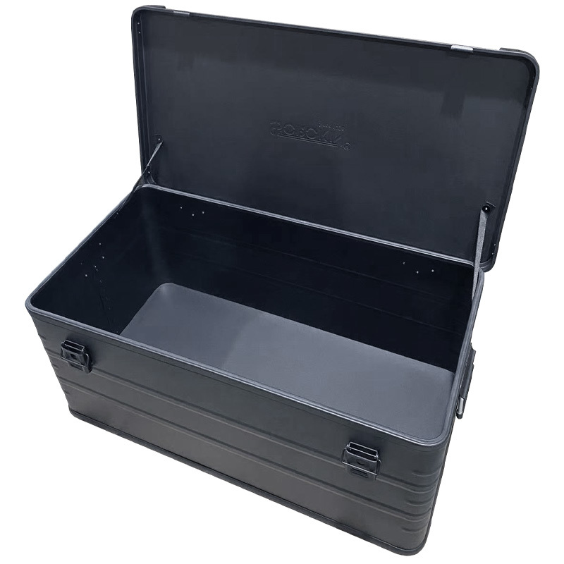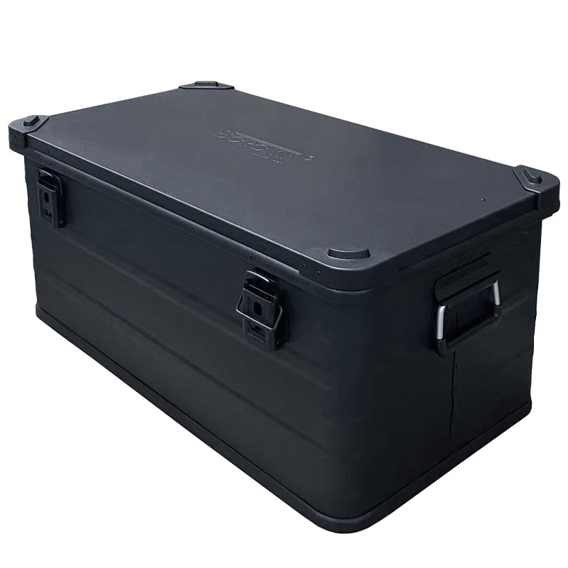 Ящик алюминиевый – новое поколение контейнеров для защиты ценных предметов от механических повреждений, влаги и пыли.Универсальный в эксплуатации ящик широко используется на водном и в автомобильном транспорте для перевозки ценных грузов, так как, благодаря своей форме, способен оставаться статичным во время качки, что делает его отличной альтернативой пластиковым ящикам и алюминиевым кейсам. Очевидным плюсом данного ящика является наличие усиленной крышки с алюминиевыми уголками для установки изделий в колонну, и корпуса с дополнительными прокатками в качестве ребер жесткости на каждой из граней ящика. Усовершенствованная технология сварки, применяемая при производстве данных сундуков не только делает внешние и внутренние швы визуально неприметными, но и обеспечивает показатели пыле- и влагозащитным кейса соответствующие классу IP 54. Ящик устойчив к ультрафиолетовому излучению, коррозии и агрессивным веществам.Вышеупомянутых особенностей конструкции и материала уже достаточно для приобретения данного ящика, но мы отдельно хотим выделить наличие приятных для пользователей деталей. Покрытие кейса из черного жидкого пластика предотвращает появление царапин на его поверхности, что сохраняет изделие в первозданном виде намного дольше чем базовые алюминиевые ящики без окрашивания. Ящик обладает подпружиненными усиленными ручками-скобами, а его крышка прикреплена к основанию широкими и прочными металлическими петлями. Ограничителем полного открытия крышки выступают стопорные ремни на прочных металлических заклёпках.Ящик может быть дополнительно укомплектован поролоновым вкладышем и ППЭ-ковриком необходимого размера и конфигурации для более безопасной транспортировки ручного и электроинструмента, а также дорогостоящей аппаратуры и других ценных вещей.