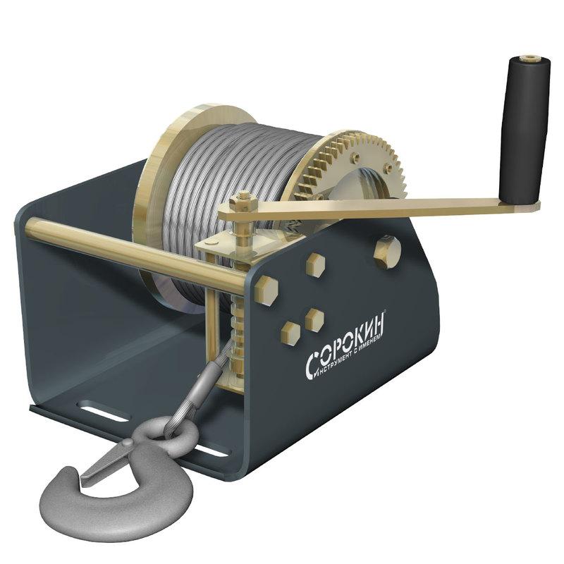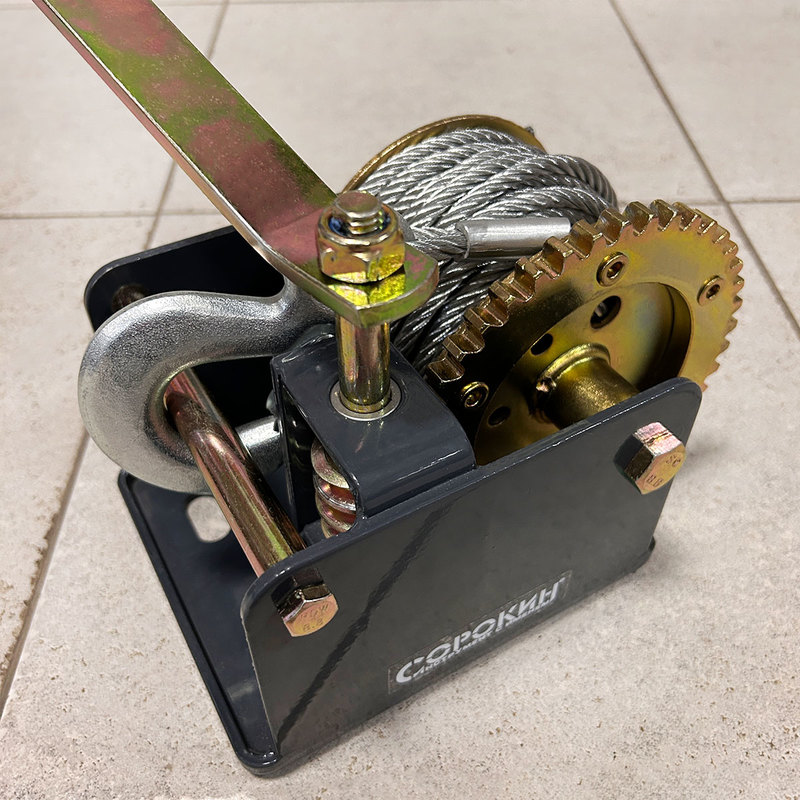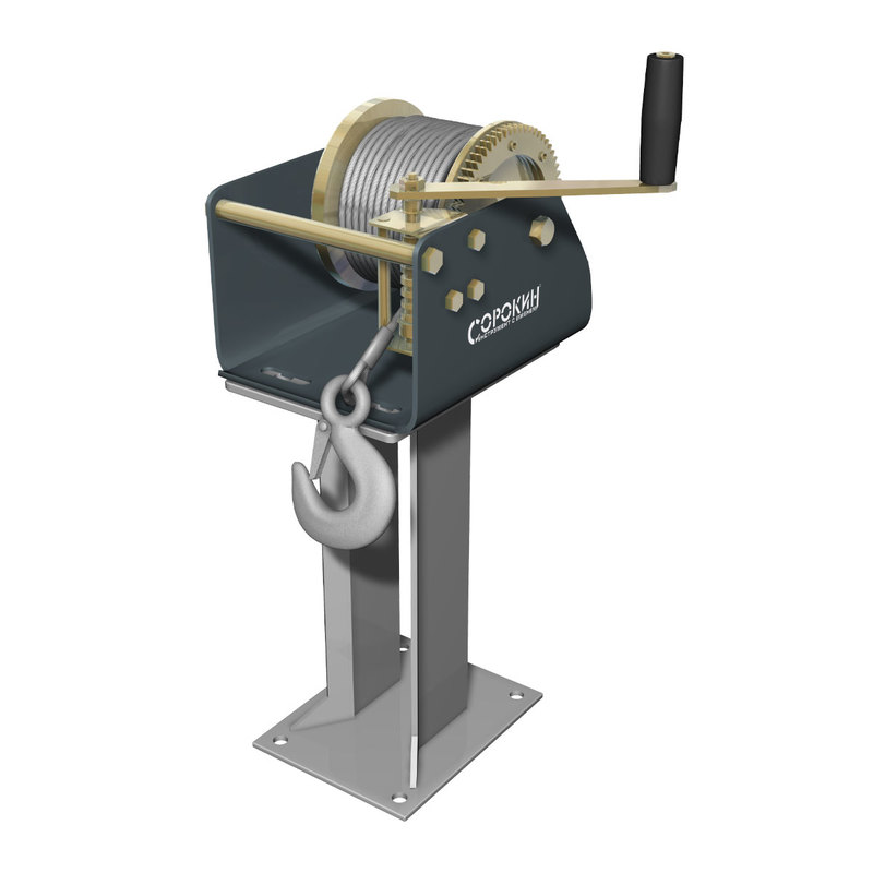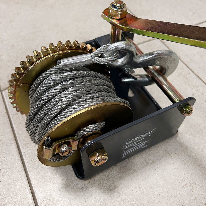 Лебёдка ручная с подготовкой на опорной части под крепление болтами. Удобна в монтаже, её можно прикрепить к любой поверхности. Может служить помощником при вытаскивании автомобиля при попадании в яму или в грязь. Десятиметрового прочного троса хватит до ближайшего столба или дерева, тяговое усилие в 1000 кг поможет сдвинуть застрявшую технику. Прочность конструкции барабана и нанесенное на поверхность сверхпрочное покрытие делает работу лебёдки безотказной и долговечной. Удлиненная рукоятка вращения барабана облегчает физические затраты при проведении работы. Прочный крюк с фиксатором надежно закрепит трос лебёдки. Лебедку рекомендуем устанавливать на консоль вертикальную для барабанных лебедок.