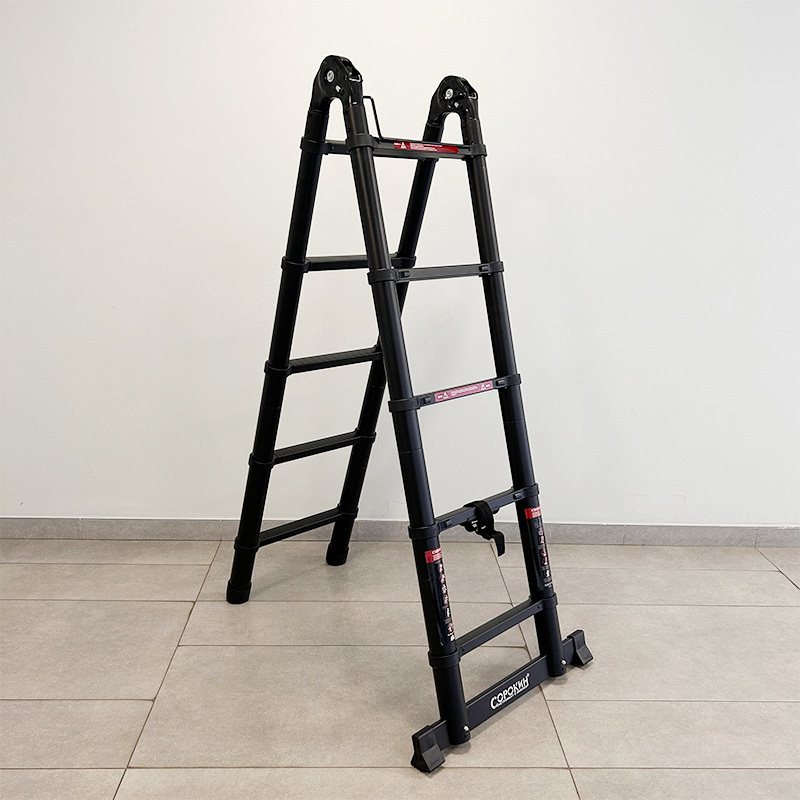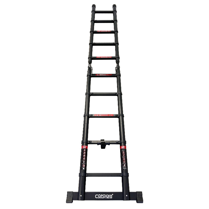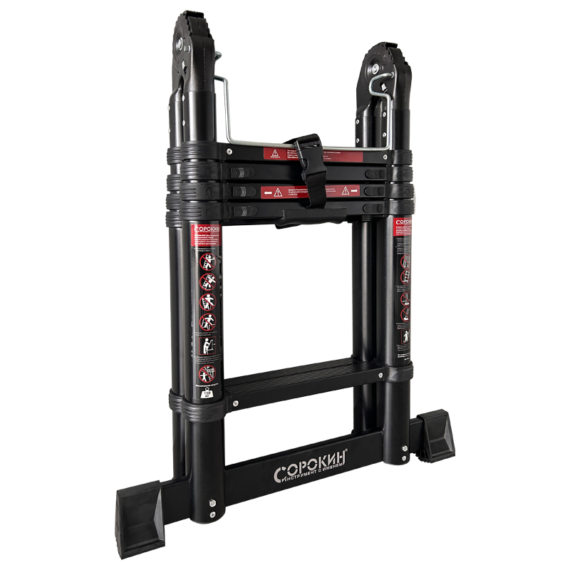 Телескопическая алюминиевая шарнирная лестница – легкая, компактная, надежная.Лестница универсальна: может применяться как двусторонняя стремянка и как приставная лестница.Ее основное преимущество – выдвижная конструкция, которая в сложенном состоянии компактна и не требует много места при хранении (поместиться в шкаф, на балкон, под кровать) и при перевозке (умещается в легковой автомобиль).При небольшом весе, из-за облегченного алюминиевого каркаса, лестница способна выдерживать нагрузку до 150 кг.Соединительные механизмы обеспечивают простоту обращения, а надежные материалы – длительную эксплуатацию.Чтобы ее разложить, достаточно потянуть за верхнюю ступень вверх. Характерный щелчок означает, что уровень зафиксирован, можно вытягивать следующий.Так же быстро она и разбирается.Благодаря телескопическому выдвижению секций от перекладины к перекладине возможно применение на лестницах, уступах, неровных поверхностях без дополнительных принадлежностей. Противоскользящие двухкомпонентные опорные заглушки препятствуют скольжению по гладкому полу.Секции телескопической лестницы состоят из опорных труб и перекладин – в зависимости от необходимости, высота лестницы может быть изменена.ВАЖНО! Перед использованием обязательно проверьте правильность установки лестницы! Соблюдайте угол наклона к стене (65-75°) и обязательно используйте страховочные пояса и другие страховочные приспособления!!!ВНИМАНИЕ! На каждой ступени имеются пластиковые фиксаторы. Лестница пригодна для использования только тогда, когда все фиксаторы встанут на свои места и защелкнутся.Шарниры должны быть заблокированы перед использованием лестницы! Фиксированное положение шарнира - 30, 105 и 180 градусов!Механизмы блокировки издают характерный щелчок при использовании, но, несмотря на это, ВСЕГДА визуально проверяйте, что рычаги заблокированы.