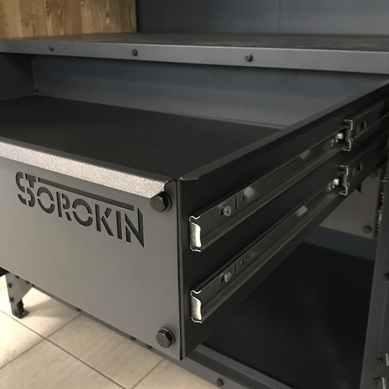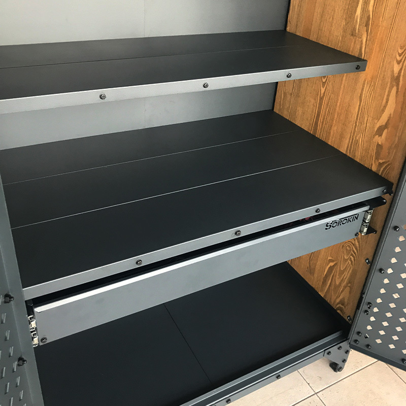 По желанию клиента возможна установка дополнительных выдвижных ящиков до 11 штук (с зазором между ящиками 1 см) и необходимое количество полок.Конструкция полок предусматривает возможность монтажа на разную глубину – 20, 40 и 60 см.