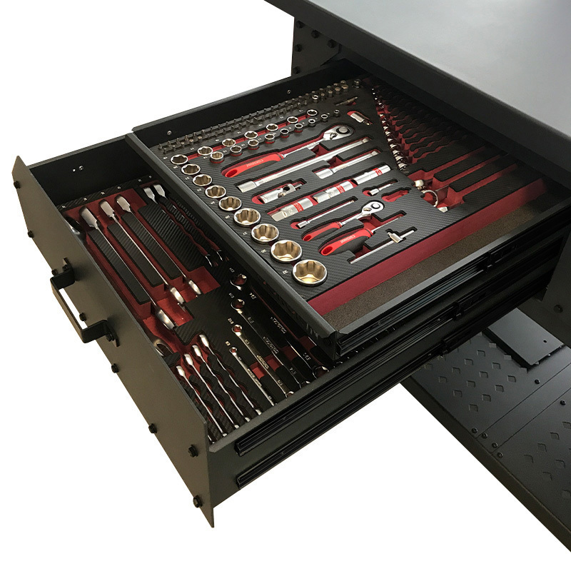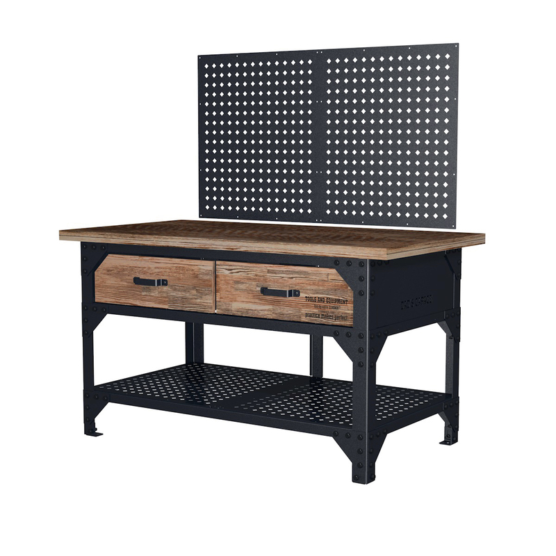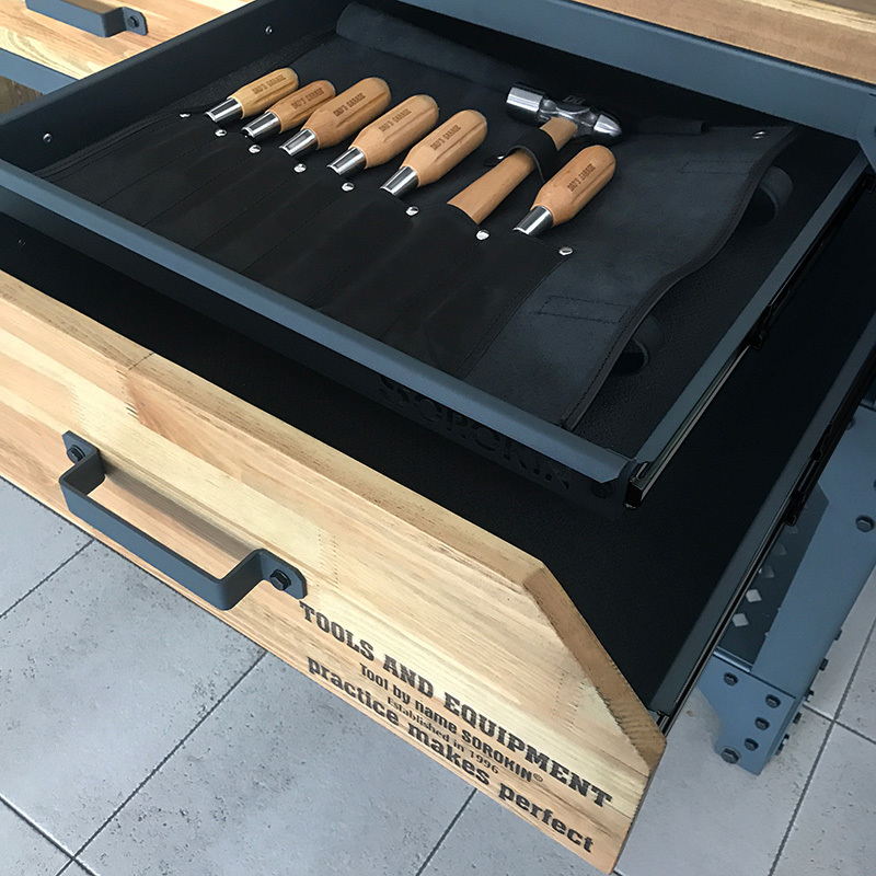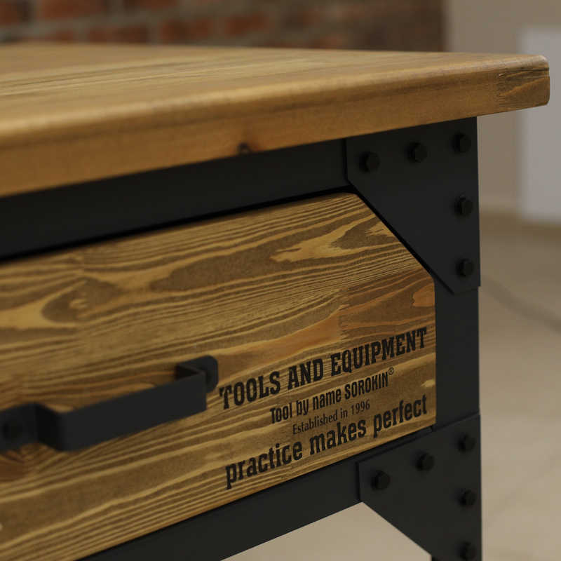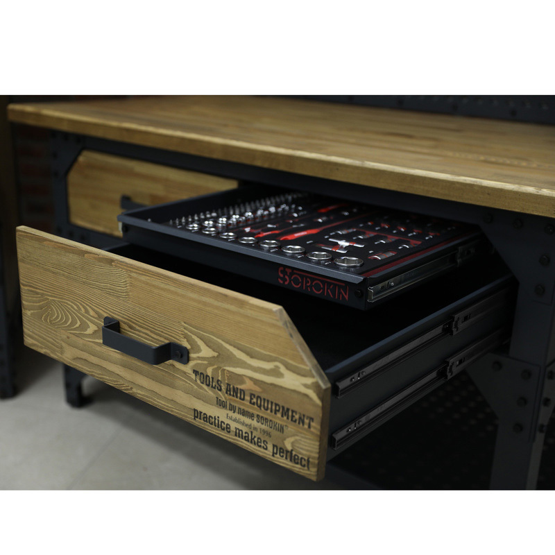 Основа верстака изготовлена из стали 3 мм.Деревянные части – массив столешницы и фасад ящиков - обработаны специальным маслом с последующей брашировкой.Качество пропитки деревянных элементов гарантирует длительное использование верстака внутри помещения без повторного нанесения масла.Оригинальная перфорация подчёркивает индивидуальный стиль изделия(для идеального сочетания стиля и практичности рекомендуется установка дополнительной перфорации над верстаком). Открытая нижняя полка является идеальным местом для хранения крупногабаритных предметов.Выдвижные ящики выдерживают нагрузку до 50 кг. Укомплектованы пенополиэтиленовыми ковриками толщиной 4 мм. Для максимально полного использования объёма боковых ящиков предусмотрен внутренний ящик с собственной нагрузкой до 15 кг, и возможностью установки как в левый, так и в правый основные ящики. Регулируемые опоры допускают установку верстака на неровной поверхности с допуском +/- 3 см.Всесторонняя порошковая окраска металла надёжно защищает изделие от коррозии.Верстаки серии DAD`s Garage создадут неповторимую атмосферу сочетания ретро и современного дизайна Вашего гаража. Тщательно продуманные элементы авторской конструкции гарантируют функциональность изделий - болты, дополнительные угловые элементы несут как эстетическую, так и практическую нагрузку.Оригинальное решение с металлическими накладками не только задаёт стилистику брутальности, но и обеспечивает дополнительную жёсткость изделий, устойчивость и способность выдерживать вес до 500 кг. DAD`s Garage - это практичность и дизайнерский подход, универсальный для стилей лофт, гранж и индастриал.Верстак поставляется в разобранном виде. Инструкция по сборке входит в комплект поставки.По желанию клиента верстак может быть поставлен в собранном виде, либо может быть произведена его сборка по месту доставки.Стоимость дополнительных услуг можно уточнить по бесплатному телефону 8 (800) 333-40-40 доб.781 "Сервисная служба"