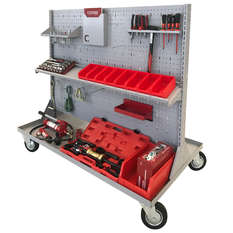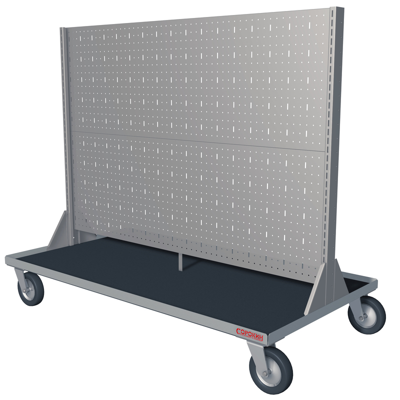 Стенд перфорированный передвижной предназначен для использования в мастерских, гаражах, на станциях СТО, в торговых залах.Опорная площадка стенда позволяет размещать пластиковые лотки различного размера, инструмент, подручные материалы.Выдерживает распределённую нагрузку до 300 кг.Несущая стенка стенда изготовлена из перфорированного металла с конфигурацией отверстий - 22х5мм (прямоугольные) / 5мм (круглые).Конструкция стенда предполагает двухстороннее размещение предметов.Для расположения инструмента отдельно приобретаются крюки,универсальные держатели, держатели отвёрток, держатели гаечных ключей, полки.Специальные держатели позволяют крепить на стенде пластиковые лотки для хранения метизов в любой удобной позиции. Большой выбор аксессуаров обеспечивает пользователю создание собственной уникальной конфигурации стенда.Усиленные колёса гарантируют плавное перемещение стенда, в том числе, и по неровной поверхности.В комплект поставки входит коврик ППЭ толщиной 4мм., предохраняющий внутреннюю поверхность опорной площадки.Двусторонняя порошковая окраска надёжно защищает изделие от коррозии.