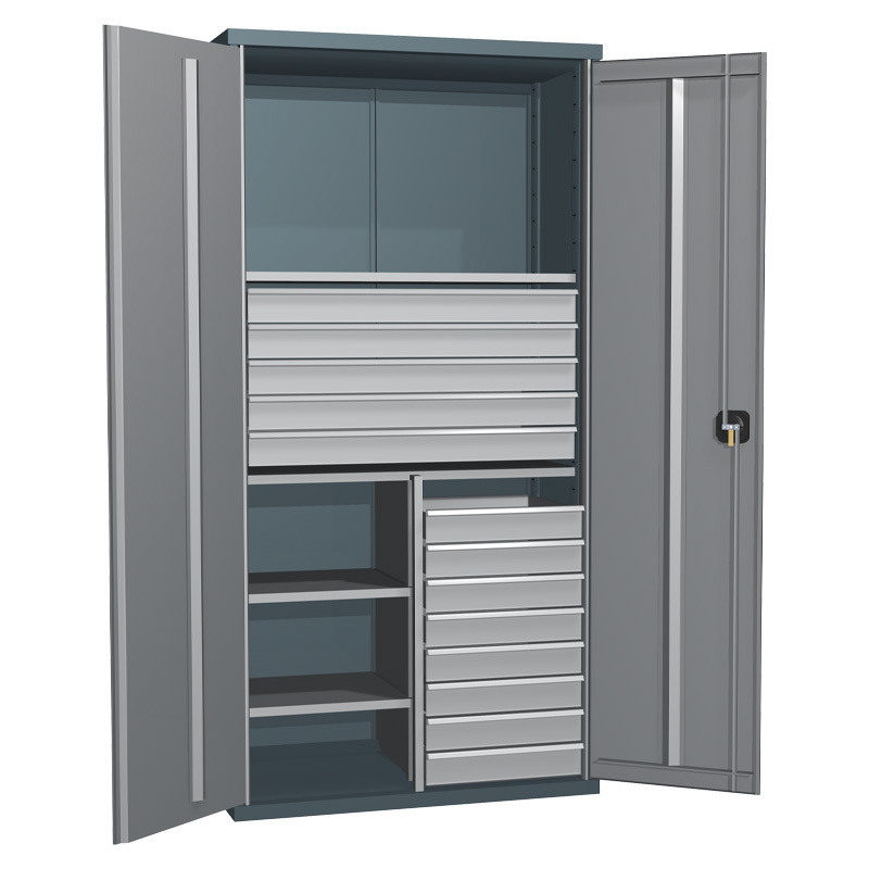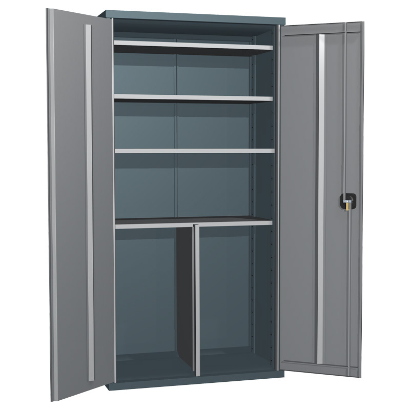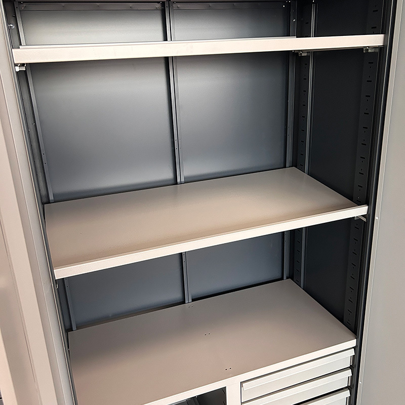 Полка изготовлена из листовой стали 0,8мм, оснащена ребром жёсткости для равномерного распределения нагрузки. Легко переставляется внутри шкафа посредством быстросъемных держателей. Максимальная нагрузка на полку – 50 кг. Внимание! При комплектации шкафа полками и ящиками, необходимо учитывать его максимально допустимую нагрузку.