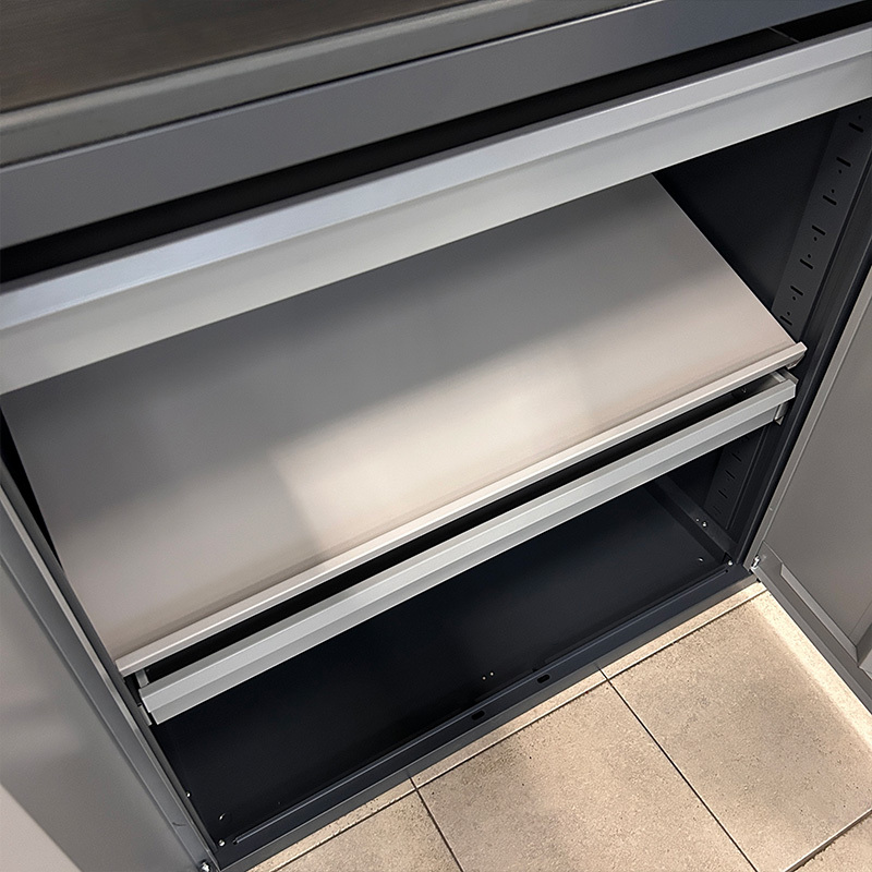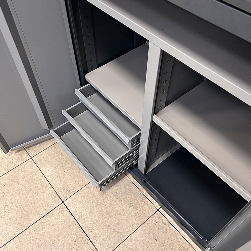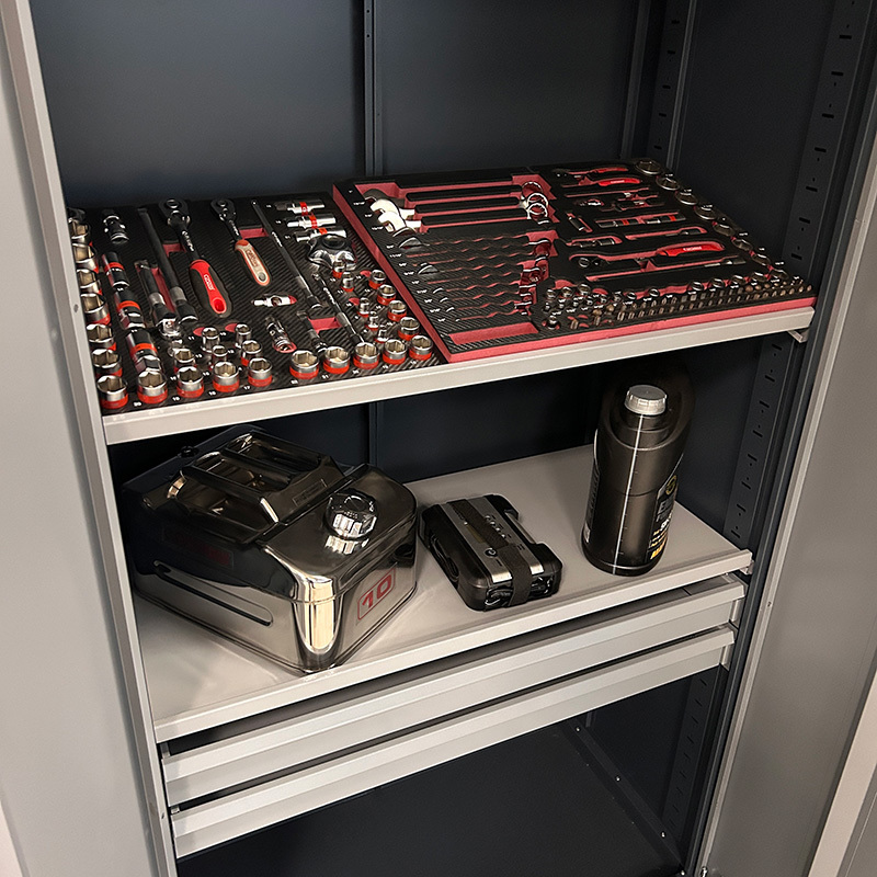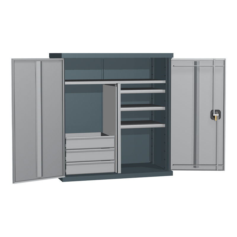 Шкаф универсальный малый предназначен для оснастки, инструмента, приспособлений, документации на рабочих местах, в гаражах, мастерских, производственных и архивных зонах. Надежное запирание дверей обеспечивается ригельной системой с замком «Евролок». Шкаф может комплектоваться полками 24.17 и ящиками 24.15 . При установке Т-образной перегородки, шкаф делится на три части и может быть укомплектован полками 24.16, 24.17 и ящиками 24.14, 24.15. Окраска элементов корпуса, ящиков и полок осуществляется порошковой полимерной эмалью. Шкаф может быть укомплектован светильником для более комфортной работы.