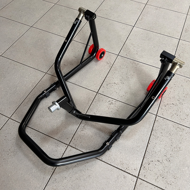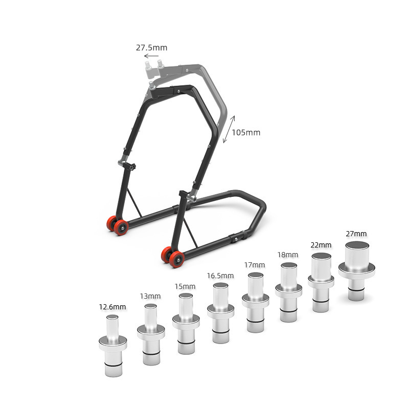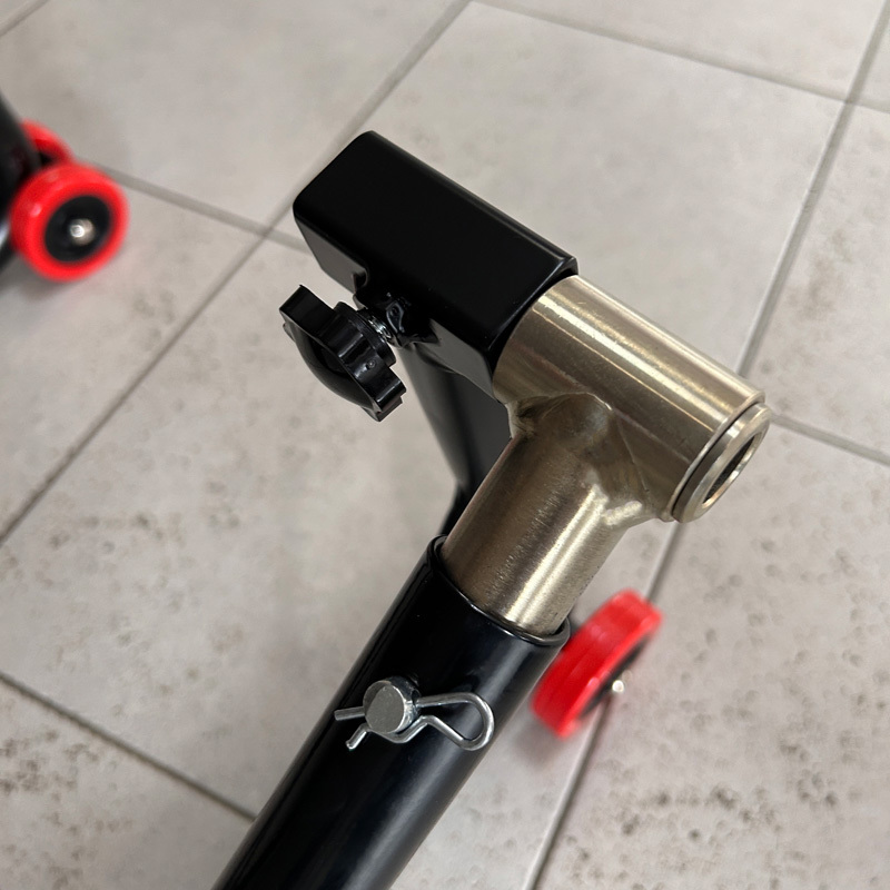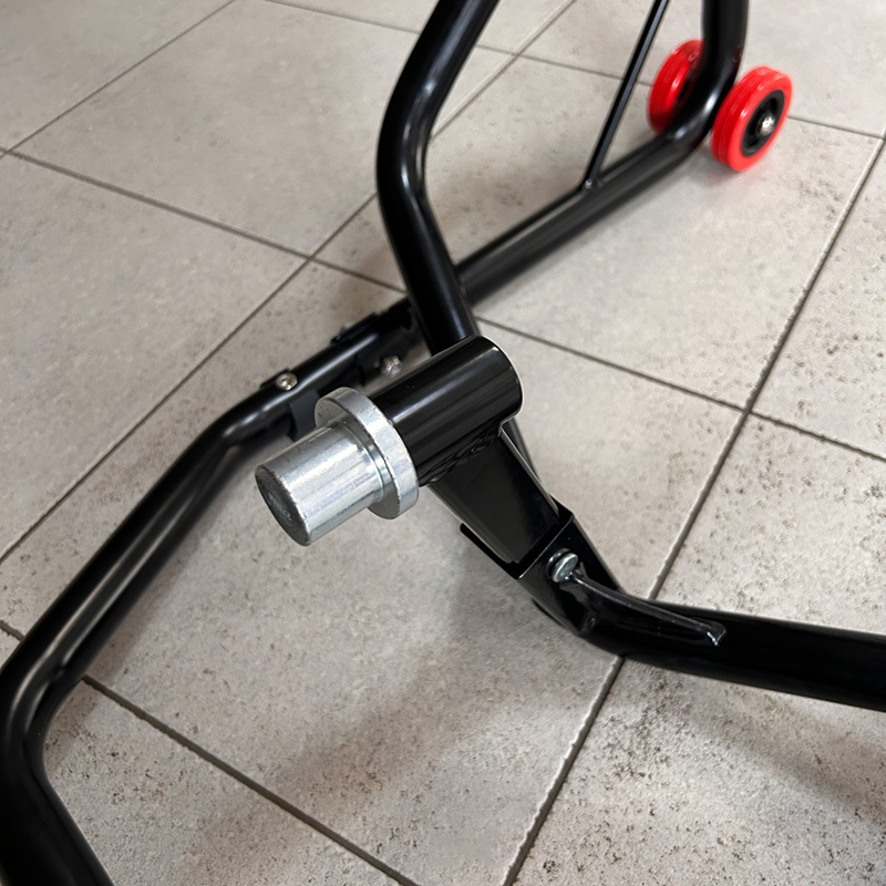 Кронштейн под траверсу, используется вместе с подкатом 16.70 и предназначен для подъёма передней части мотоцикла за рулевую колонку, а именно нижнюю траверсу. Специальная опорная втулка помещается в отверстие нижней траверсы. Вывешивать переднее колесо мотоцикла можно с использованием силы одного человека. Данный способ установки позволяет обслуживать переднее колесо, а также рулевую колонку, например, для снятия вилки с целью замены сальников. Кронштейн под траверсу усилен дополнительными укосинами. Держатель опорных втулок имеет регулировку по вылету, а сам кронштейн - регулировку по высоте с быстрой фиксацией при помощи шпилек со стопорным штифтом. В зависимости от посадочного отверстия можно приобрести к кронштейну 8 опорных втулок наиболее востребованных диаметров: 12,6; 13; 15; 16,5; 17; 18; 22 и 27 мм. Мотоподкат универсальный изготовлен из профильной трубы круглого сечения диаметром 32 мм. Толщина металла 1,5 мм. Подходит для мотоциклов весом до 350 кг.Колёсная база имеет фиксированную высоту в 330мм. Стопорные винты гарантируют надёжную фиксации подхватов.Съёмные рукоятки 16.71 и 16.72 снабжены PVC-опорами, что обеспечивает сохранность металлической части при соприкосновении с поверхностью.Подхватыпод слайдеры изготовлены из стали;под вилку - из нержавеющей стали в корпусе из нейлонового стекловолокна;под маятникиуниверсальныеизготовлены из стали с накладками из поливинилхлорида.Мотоподкат оборудован сдвоенными композитными колёсами из полипропилена и поливинилхлорида.Качественная порошковая окраска металлических частей мотоподката предотвращает коррозию и гарантирует длительный срок службы.Скомпоновать мотоподкат в соответствии с индивидуальными требованиями можно с помощью конфигуратора.