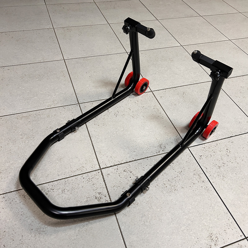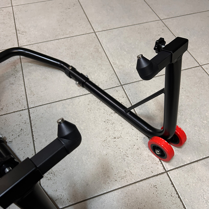 Подхваты под перья вилки переднего колеса осуществляют подхват передней части мотоцикла при помощи фиксации в конусных отверстиях нижней части пера вилки. Не мешают при работе с колесом и подвеской.Рекомендуется применять совместно с подкатом для заднего колеса или с устройством фиксации вращения рулевой колонки. Используются вместе с подкатом 16.70.Мотоподкат универсальный изготовлен из профильной трубы круглого сечения диаметром 32 мм. Толщина металла 1,5 мм. Подходит для мотоциклов весом до 350 кг.Колёсная база имеет фиксированную высоту в 330мм. Стопорные винты гарантируют надёжную фиксации подхватов.Съёмные рукоятки 16.71 и 16.72 снабжены PVC-опорами, что обеспечивает сохранность металлической части при соприкосновении с поверхностью.Подхватыпод слайдеры изготовлены из стали;под вилку - из нержавеющей стали в корпусе из нейлонового стекловолокна;под маятникиуниверсальныеизготовлены из стали с накладками из поливинилхлорида. Кронштейн под траверсу усилен дополнительными укосинами. Держатель опорных втулок имеет регулировку по вылету, а сам кронштейн - регулировку по высоте с быстрой фиксацией при помощи шпилек со стопорным штифтом. Мотоподкат оборудован сдвоенными композитными колёсами из полипропилена и поливинилхлорида.Качественная порошковая окраска металлических частей мотоподката предотвращает коррозию и гарантирует длительный срок службы.Скомпоновать мотоподкат в соответствии с индивидуальными требованиями можно с помощью конфигуратора.