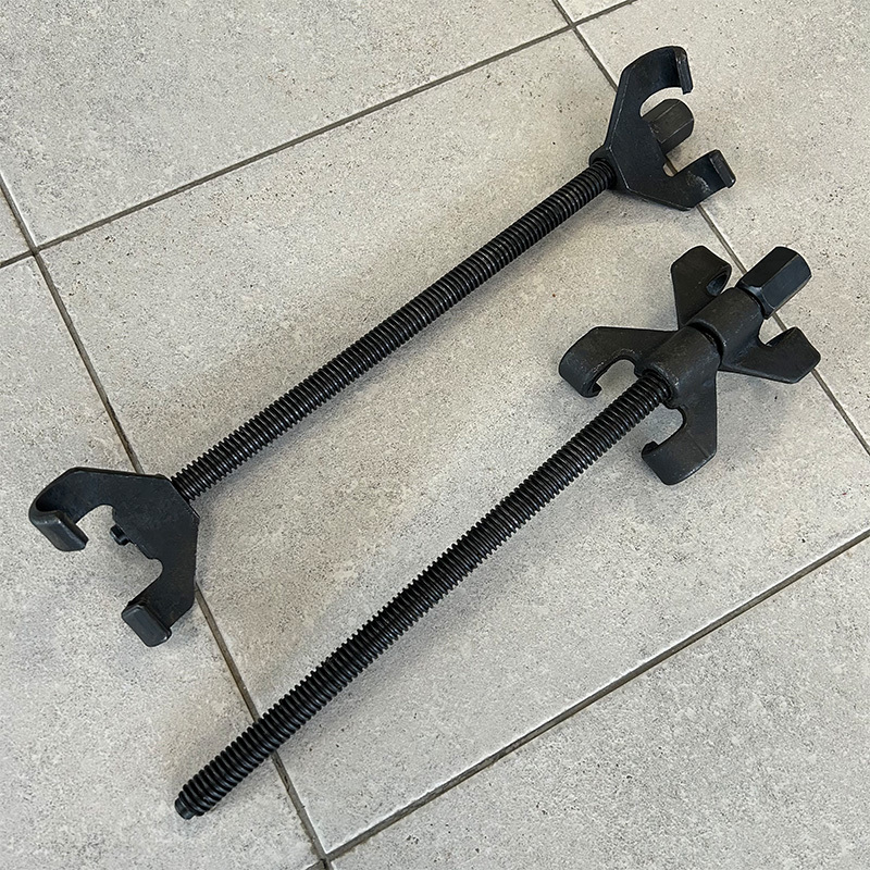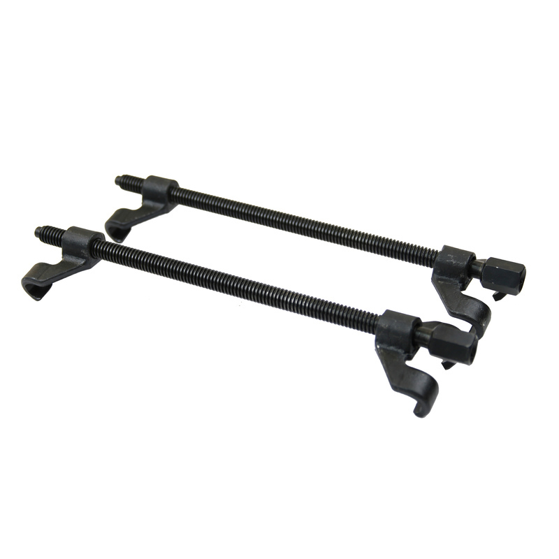 Комплект съёмников пружин предназначен для фиксации в сжатом состоянии пружин подвески автомобиля, также могут быть использованы и в других целях. Конструкция стяжек позволяет работать в ограниченном пространстве под аркой. Конструкция с винтом из закаленной хромованадиевой стали под 1/2", полуматовое покрытие, литые захваты, твёрдость и износостойкость гарантируют профессиональное качество инструмента. Максимальный зёв 370 мм.