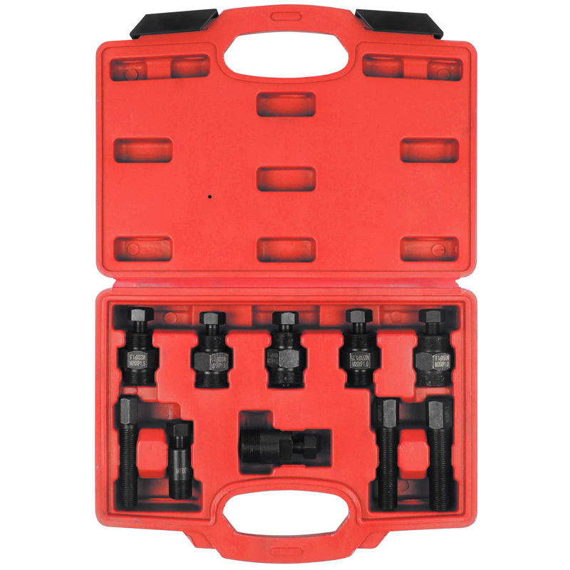 Полный набор съемников маховика для отделения маховика от конуса коленчатого вала.Имеет десять съемников, пять из которых имеют двойную рабочую часть, что обеспечивает более широкое применение.Подходит для Yamaha, Honda, Suzuki, Bosch, wasaki, Ducati и многих других.Поставляется в кейсе для хранения.Особенности:Комплект из 10 компонентов, обеспечивающий 15 комбинацийДля большинства мотоциклов, внедорожников и квадроциклов.Высококачественная инструментальная стальЗа исключением M27x1.0, все детали с правой резьбойРазмеры:M14x1,5M16x1,5M18x1,5M28x1.0 / M26x1.0M25x1,5 / M22x1,0M28x1,5M19x1.0M26x1,5 / M22x1,5M27xp1,25 / M20x1,0M27xp1.0 Л / M24x1.0Материал: Сталь