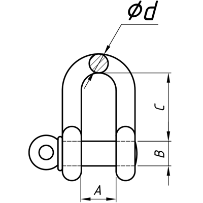 Шакл применяется для соединения тросов, строп, крепления троса к буксирной проушине или фаркопу, для ремонта цепей, создания растяжек и в других видах работ. Фиксация штифта в проушине осуществляется за счёт резьбового соединения. Шакл изготовлен путём ковки из закалённой стали. Максимально допустимая нагрузка составляет 2,2 от номинальной (см. табл. тех. характеристик). Предел прочности на разрыв составляет от 4 до 6 раз от номинальной нагрузки в зависимости от условий работы.