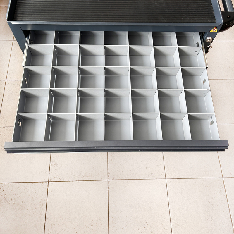 Разделители выдвижного ящика тележки 9.5- удобное решение для сохранения порядка. Минимальный размер ячейки 8х8см. Купить разделители в ящик вы можете, позвонив по бесплатному телефону 8 (800) 333-40-40 или оформив заявку на сайте, а также в фирменных магазинах ТД СОРОКИН®.