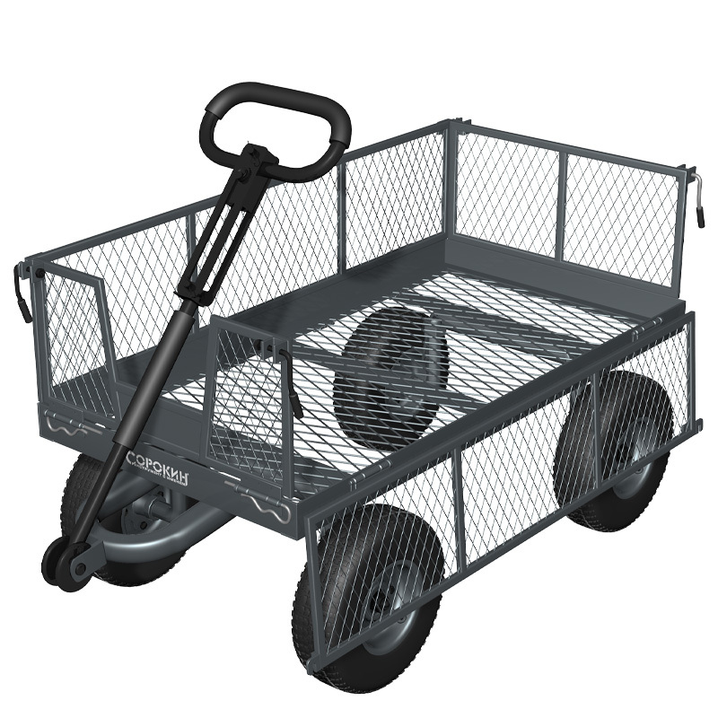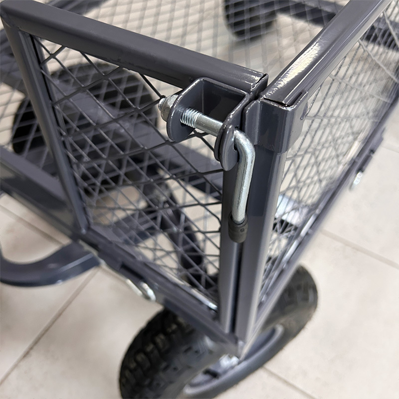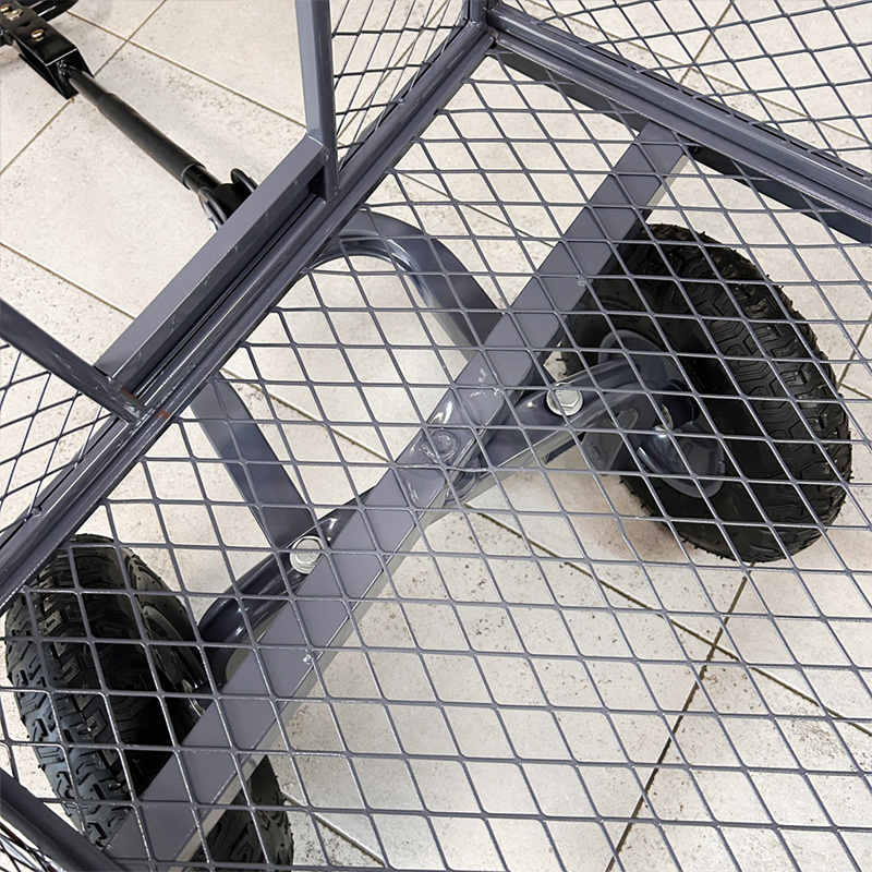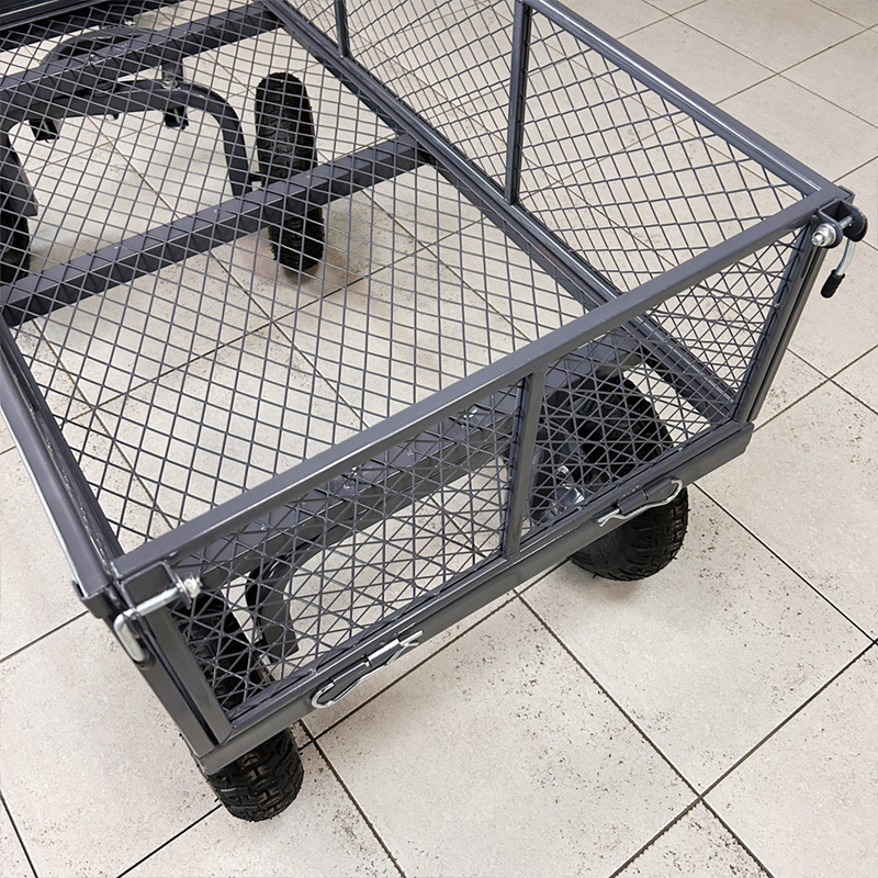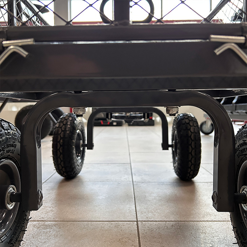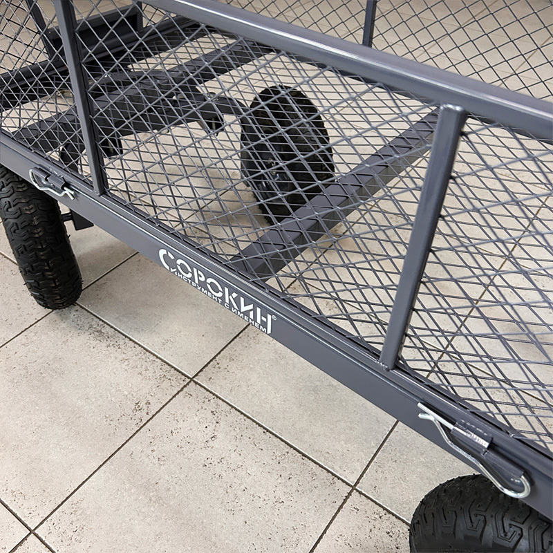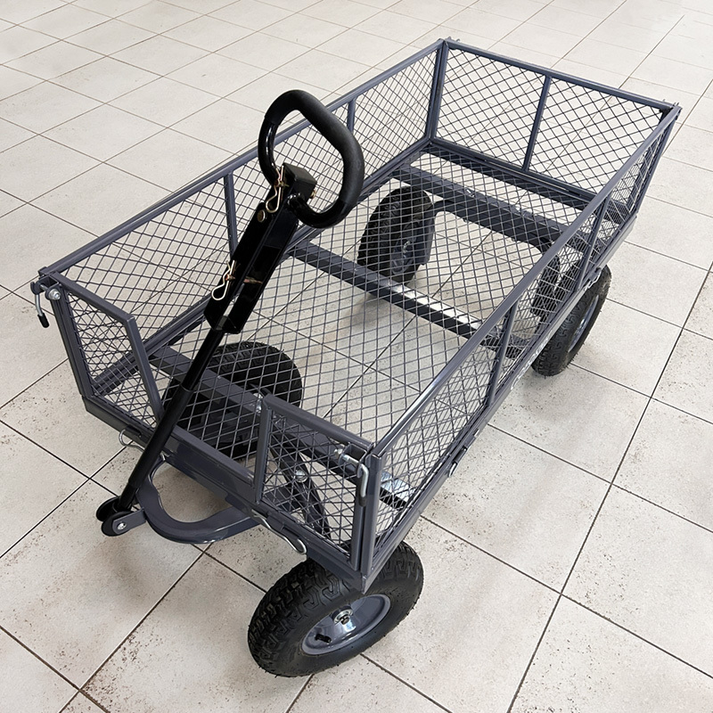 Четырёхколёсная тележка предназначена для перевозки груза по складским и производственным помещениям, а так же в бытовых и хозяйственных целях. Тележка позволяет заменить ручной труд, делая транспортировку грузов более быстрой и эффективной. Сетчатое дно тележки усилено точечной сваркой к поперечным балкам, которые представляют в разрезе квадратный профиль, что выгодно отличает изделие от тележек других производителей.Тележка имеет прочный каркас на пневматических колёсах, гарантирующих мягкий ход, на дисках, усиленных сплошным сварочным швом. Поворотная ручка тележки делает её мобильной и удобной в маневрировании, а новая система крепления позволяет совершать разворот практически на месте. Ещё один важный момент в конструкции верхней части ручки - это возможно её крепления к фаркопу квадроцикла или минитрактора. Все детали покрыты порошковой краской, что обеспечивает защиту от коррозии и воздействия неблагоприятных погодных условий.Будьте внимательны! При погрузке тяжелых предметов, не имеющих плоской опорной части, используйте подкладки, для того чтобы избежать повреждения сетчатого дна тележки.