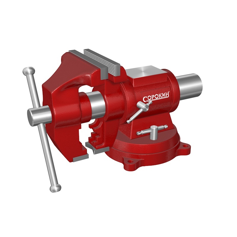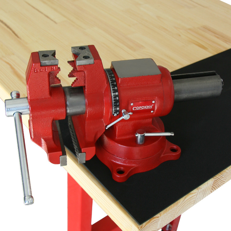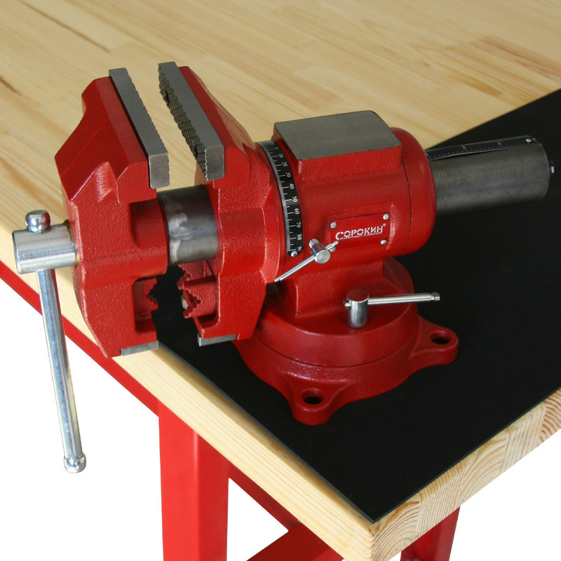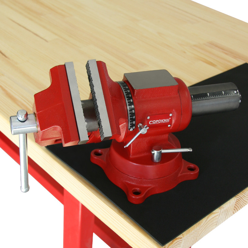 Тиски многофункциональные (слесарные, поворотные, настольные) изготовлены из ковкого чугуна, оборудованы вспомогательными зажимами для работы с изделиями нестандартной формы.Удобство использования обеспечивается вращением в двух плоскостях: основание и зажимной рабочий блок поворачиваются на 360 градусов, что гарантирует максимальную функциональность приспособления.Благодаря чугунному корпусу модель отличается устойчивостью к высоким нагрузкам.Съёмные губки легко демонтируются и заменяются в случае износа.Прямоугольная наковальня предназначена для проведения мелких ударных работ.Крепление к рабочей поверхности осуществляется с помощью болтов через четыре отверстия.Устанавливаются на верстакили другую производственную мебель.Материал воротков имеет гальваническое покрытие, что обеспечивает длительный срок службы.Порошковая окраска надежно защищает изделие от коррозии.