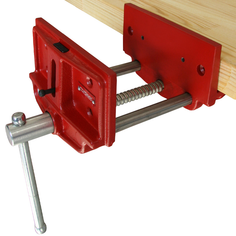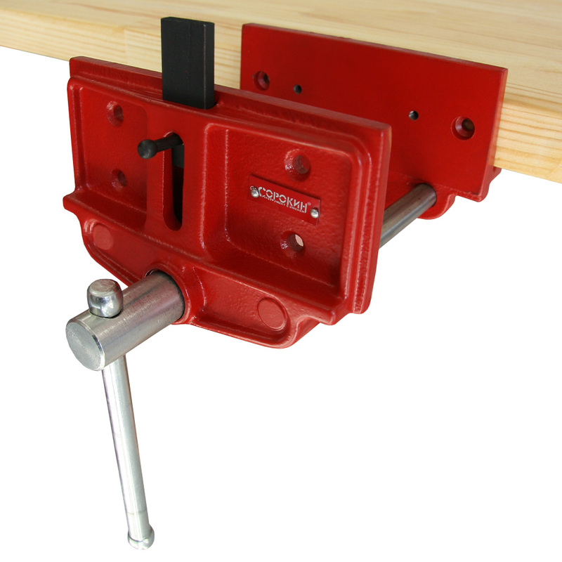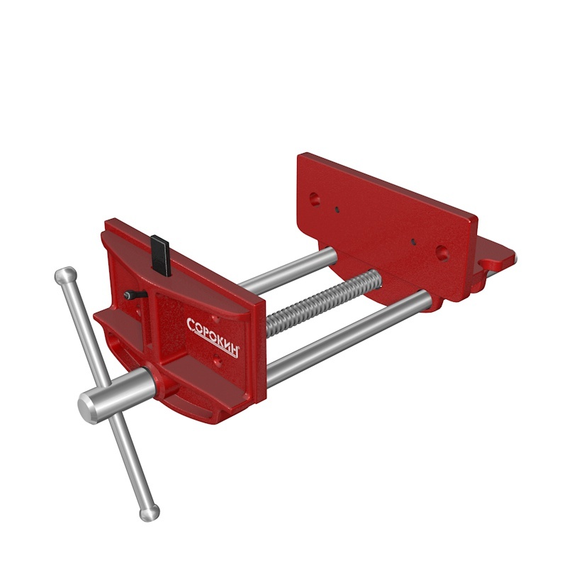 Верстачные столярные тиски (плотницкие) из прочного чугуна предназначены для крепления к верстаку снизу и имеют вместе с ходовым винтом направляющие стержни.Стальной винт с трапецеидальной упорной резьбой обеспечивает быстрое перемещение, большое усилие зажима и гарантирует плавный ход рабочих губок.Регулировка хода двойными стальными направляющими позволяет равномерно распределять контакт между губками и обрабатываемой деталью и задаёт максимальное сцепление.Тиски оснащены гладкими стальными губками с большой площадью поверхности, что позволяет избежать повреждения обрабатываемого материала.В конструкции предусмотрены отверстия для монтажа защитных накладок из дерева, фанеры, полиуретана и т.д. для работы с мягкой древесиной.Специальная защелка обеспечивает возможность свободно изменять положение передней части конструкции.Удобная рукоятка металлического воротка позволяет быстро зафиксировать заготовку.Порошковая окраска надёжно защищает изделие от коррозии.
