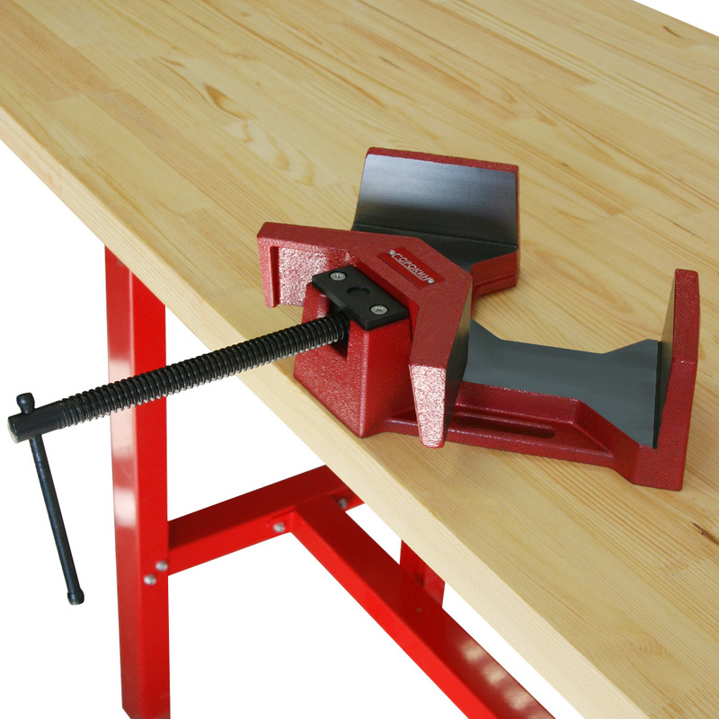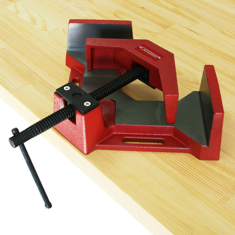 Тиски угловые (перпендикулярные тиски, зажим для угловых соединений, сварочный зажим) используются в производственных цехах, мастерских при монтажных и сварочных работах. Изготовлены из высокопрочного чугуна.Являются необходимым приспособлением для закрепления заготовок при монтаже и сварке конструкций.Тиски монтируются на рабочий стол металлообрабатывающих станков и на сварочно-монтажные столы через отверстия-пазы, что позволяет сократить время на их установку и обеспечивает точность позиционирования.Губки тисков жёстко фиксируют деталь. Отсутствие люфта гарантирует неподвижное положение заготовки в процессе обработки. Т-образная рукоятка обеспечивает максимальную передачу усилия.Порошковая окраска надёжно защищает от коррозии.
