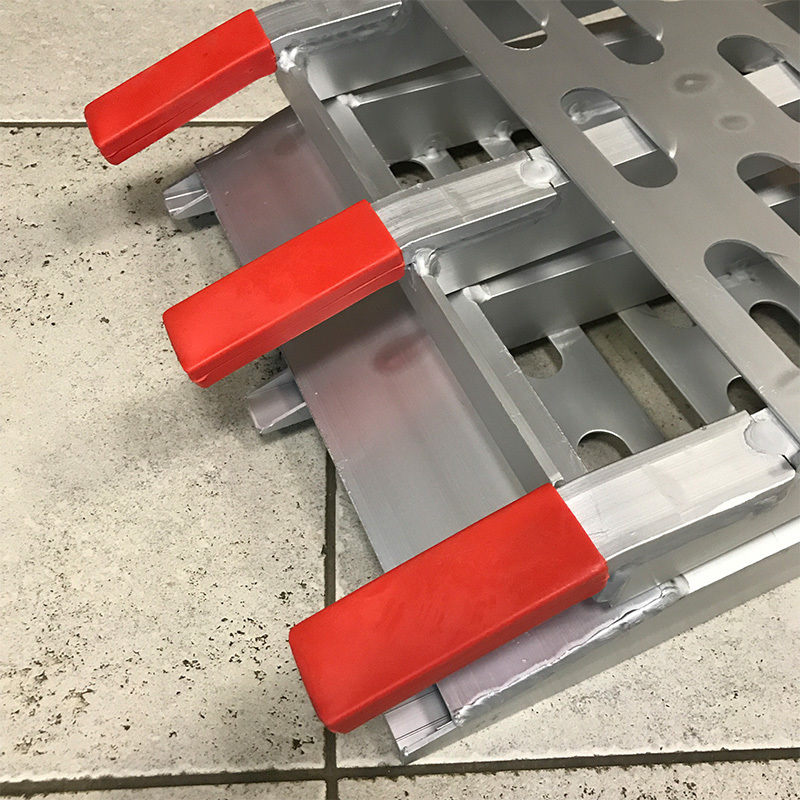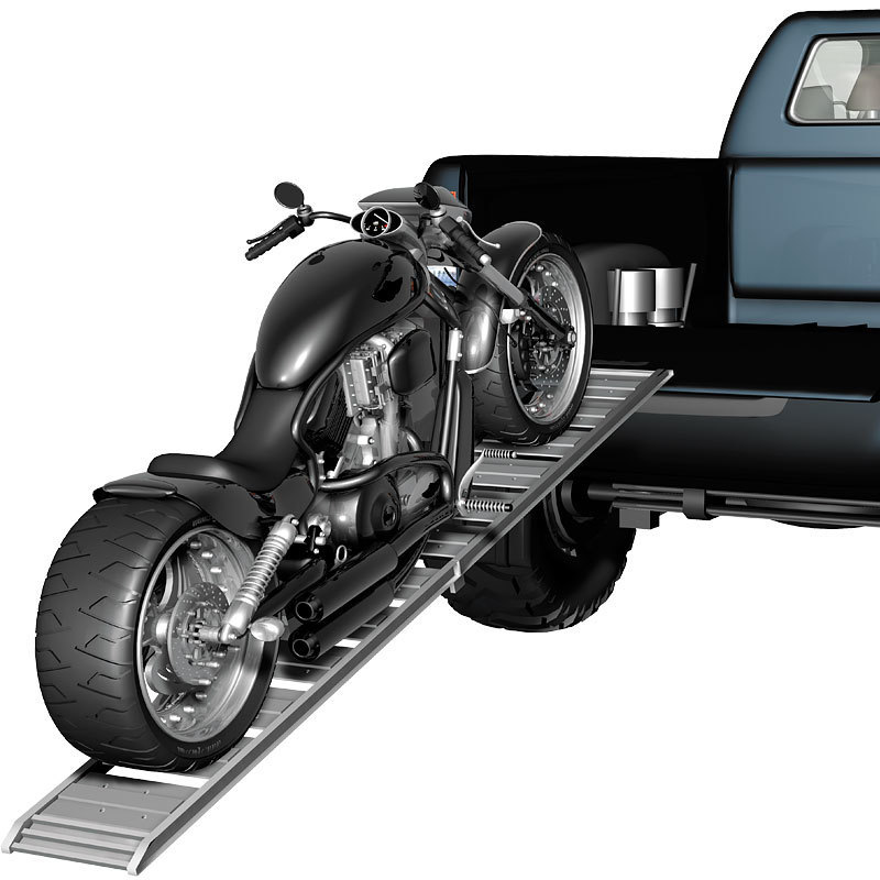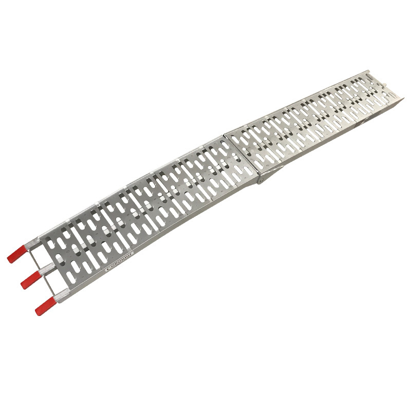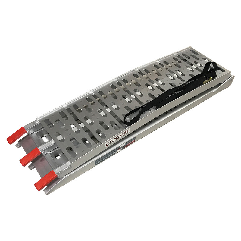 Складной алюминиевый трап для мототехники имеет малый вес и габариты (в сложенном состоянии), удобен для заезда мотоциклов и квадроциклов в пикап (фургон). Имеет усиленные петли и раму (вес мотоцикла до 300 кг) Имеет дополнительную вставку-пластину для надежной фиксации трапа на борту фургона.