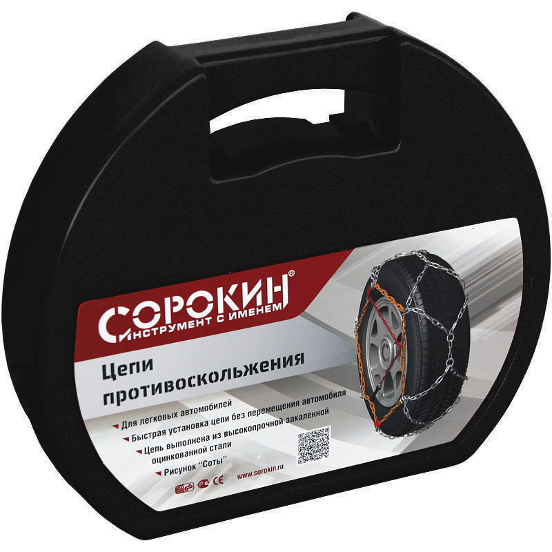Цепи противоскольжения устанавливаются на шины автомобиля для обеспечения большей устойчивости при движении на льду, на рыхлых и неустойчивых грунтах и заснеженных зимних дорогах, и позволяют преодолеть даже самые труднопроходимые участки. Для изготовления цепей противоскольжения используется высокопрочная закалённая сталь, что гарантирует надежность и долговечность изделия. Конструкция цепи позволяет производить установку цепи на колесо без перемещения транспортного средства. Цепи с шагом 12 мм, возможно использовать на легковых автомобилях. Комплект из двух цепей, поставляется в удобном пластиковом кейсе.