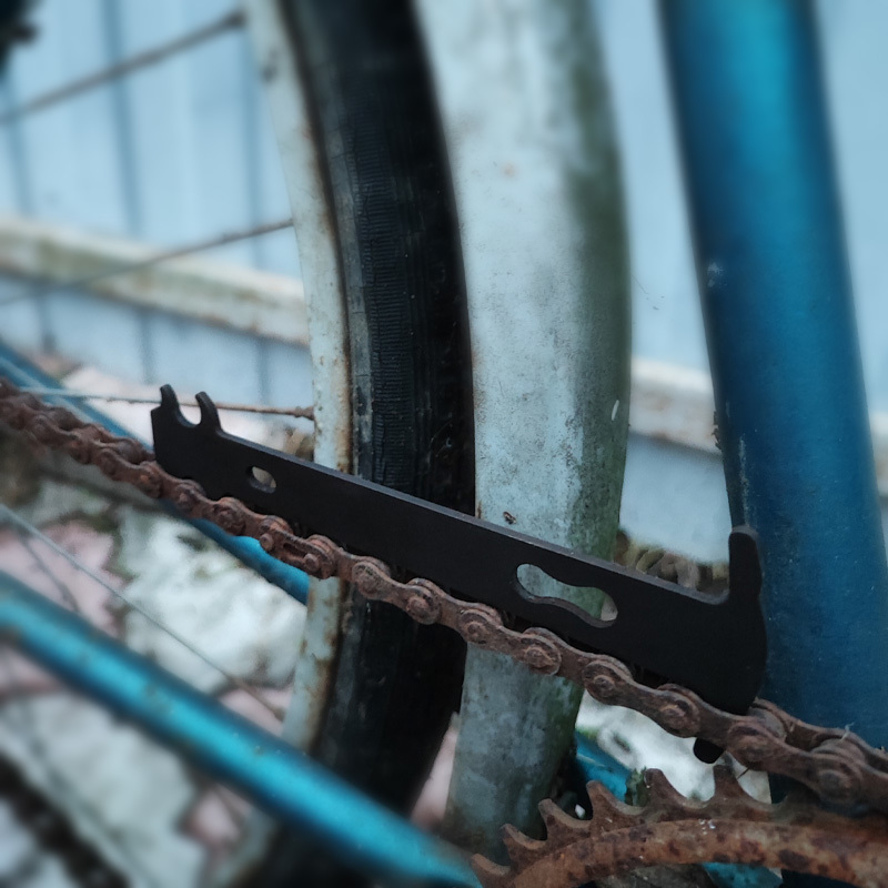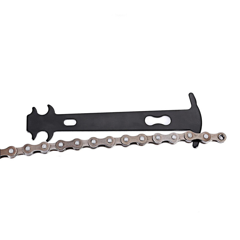 Измеритель износа цепи выступает в роли индикатора растяжения(износа) велосипедной цепи.Аксессуар изготавливается из стали и применяется для измерения растяжения различных многоскоростных и односкоростных цепей. Измеритель на противоположных сторонах имеет два значения износа цепи с одной 75%, с другой - 100%. В случае когда измеритель погружается в цепь стороной 75% - износ цепи составляет 75% и лучше её заменить.Когда в цепь погружается сторона измерителя 100% - то износ цепи составляет 100% и её однозначно нужно заменить.В случае когда индикатор не способен погрузиться в цепь ни одной из сторон, тогда износ цепи составляет менее 50% и такую цепь можно использовать далее.
