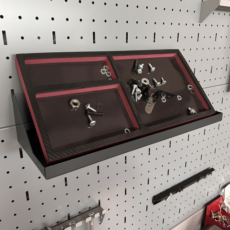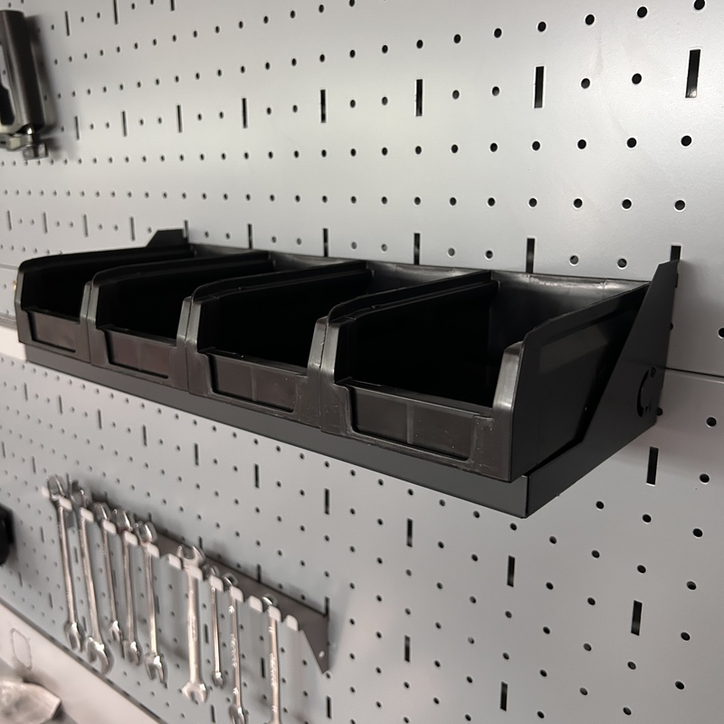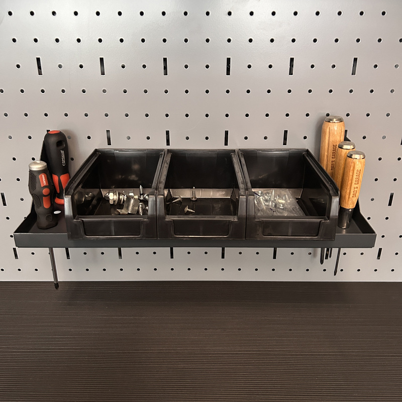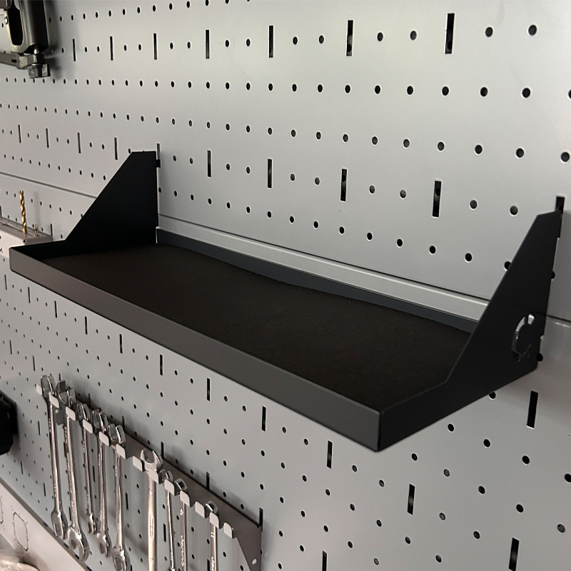 Полка на перфорацию применяется для хранения и удобного размещения различных мелких деталей, крепежа, аэрозольных балончиков, лотков, инструмента и изготовлена для использования на перфорированных панелях( Small , Standart , Great ). Но, благодаря универсальному креплению может быть установлена и на перфорированные панели DAD`s Garage. Полка может быть установлена на тумбы и опоры для верстака