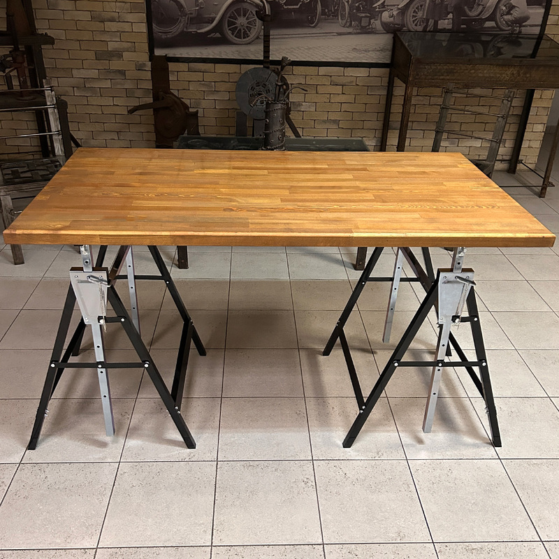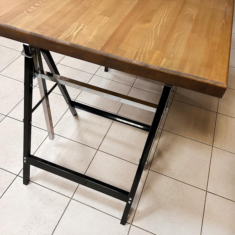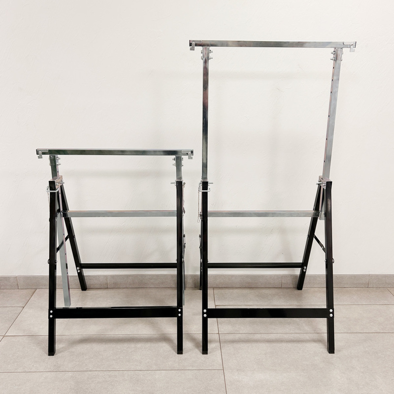 Металлические складные козлы предназначены для организации эргономичной рабочей поверхности при размещении, нанесении разметки, распиле и обработке различных строительных материалов. Специальные отверстия в верхней балке позволят надёжно зафиксировать настил рабочей поверхности, или закрепить сверху небольшой деревянный брусок/резиновый коврик. Монтажные отверстия в регулировочной рейке позволят задать необходимую высоту поверхности для удобной работы.Металлические складные козлы(подстолье) изготовлены из листовой стали и покрыты порошковой краской для защиты от коррозии.В сложенном состоянии подстолье легко транспортируется и удобно хранится благодаря компактным размерам.Нижняя перемычка опор предназначена для придания жёсткости конструкции и имеет дополнительные ниши для хранения используемого при работе инструмента, такого как отвёртки, ножи, стамески и всякие приспособления для фиксации материалов. Для эффективной работы с крупным погонным материалом рекомендуется использовать три и более изделий.